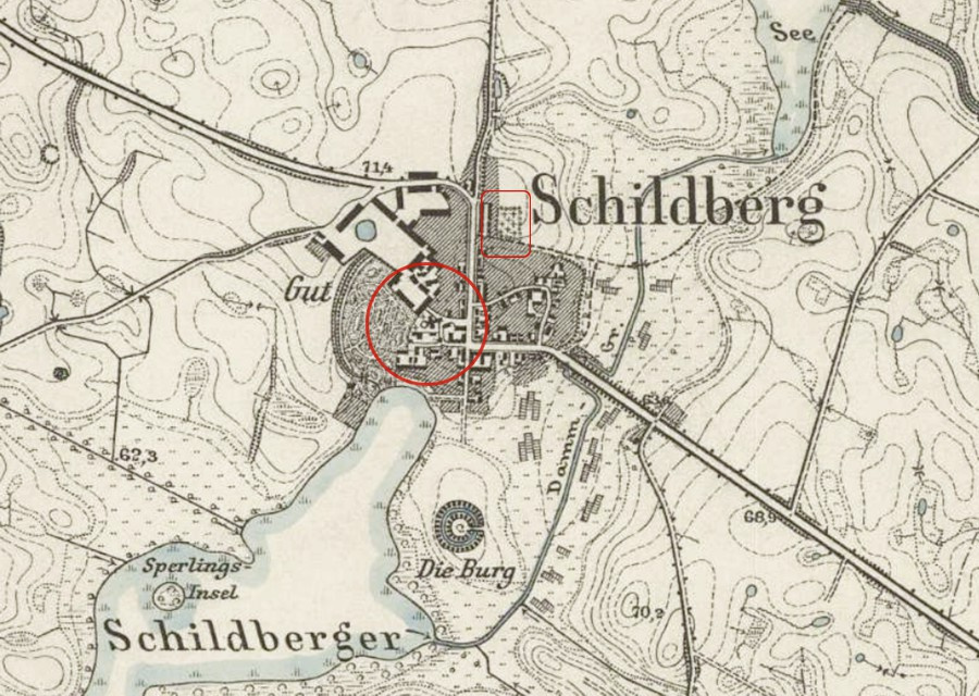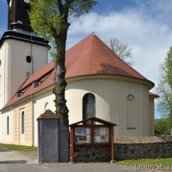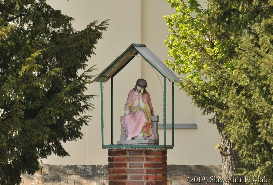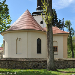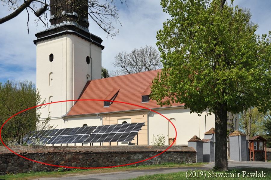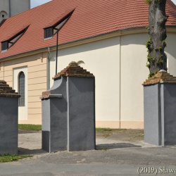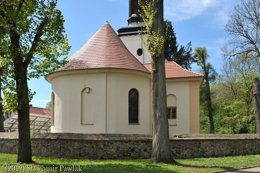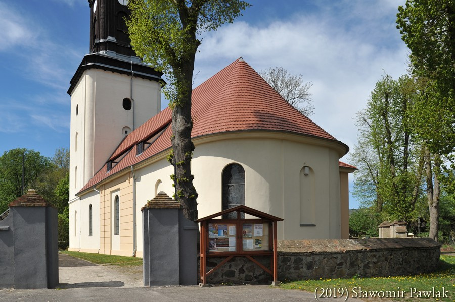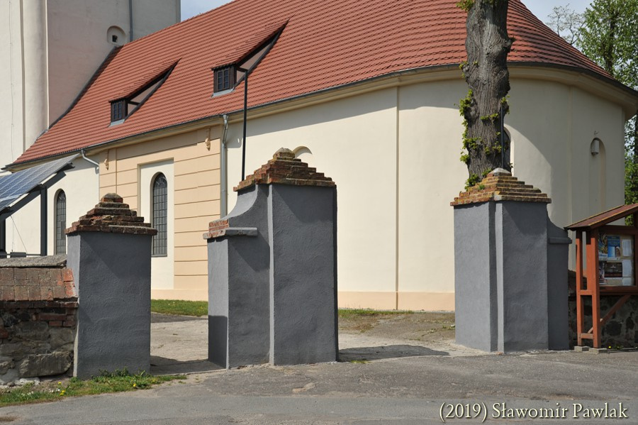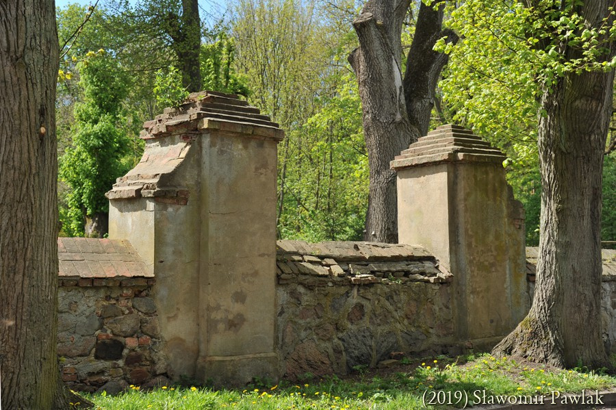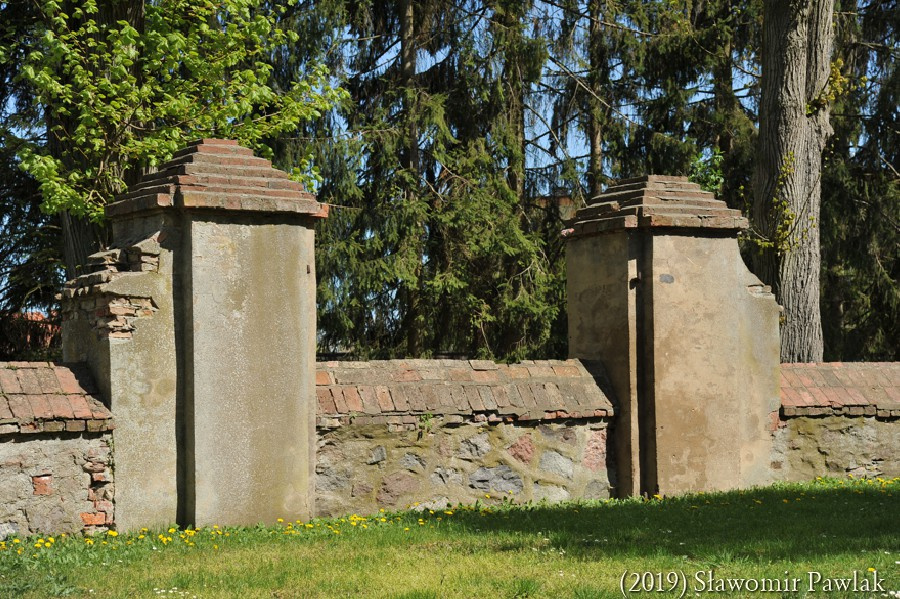 Plac kościelny otoczony niskim kamiennym murem pełnił funkcję lokalnej nekropolii. Bramki i furty wjazdowe usytuowano po stronie wschodniej, zachodniej oraz północnej. Obecnie jedyną przejezdną pozostaje bramka wschodnia. Na początku XX wieku po północnej stronie wiejskiej zabudowy utworzono nowy cmentarz z kaplicą przedpogrzebową. Czynny jest do dzisiaj, jednak większość nagrobków niemieckich po roku 1945 została usunięta.