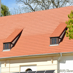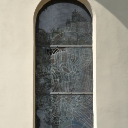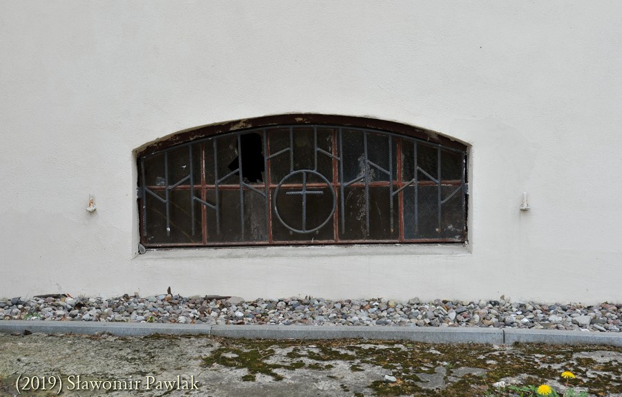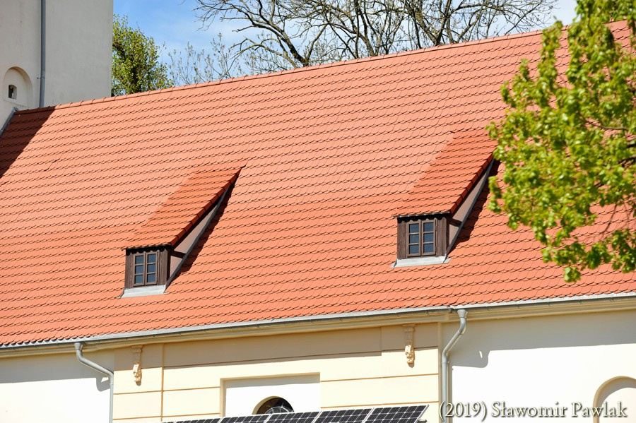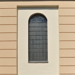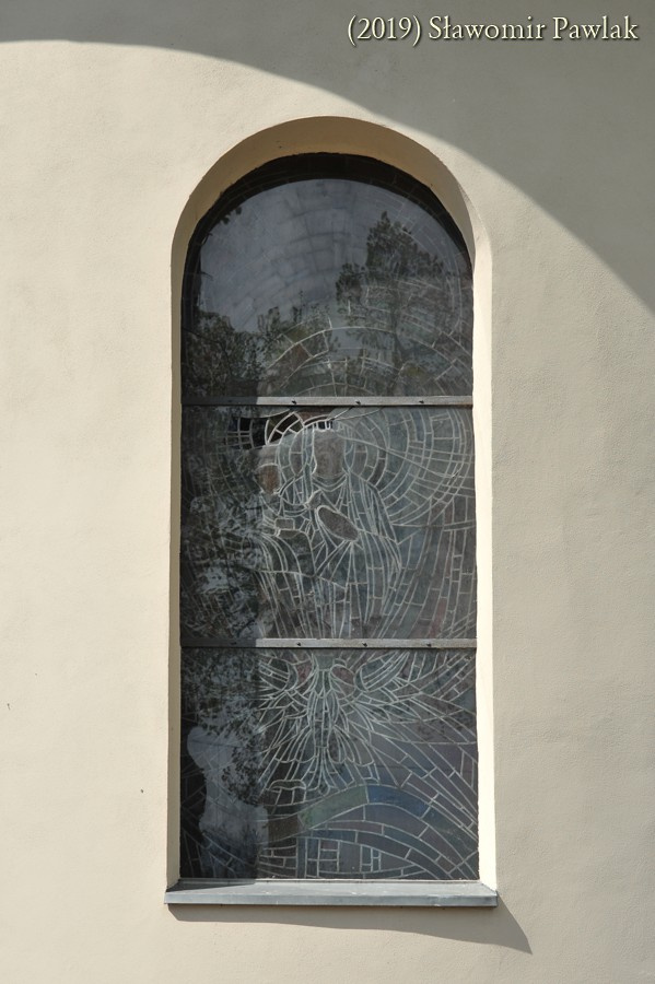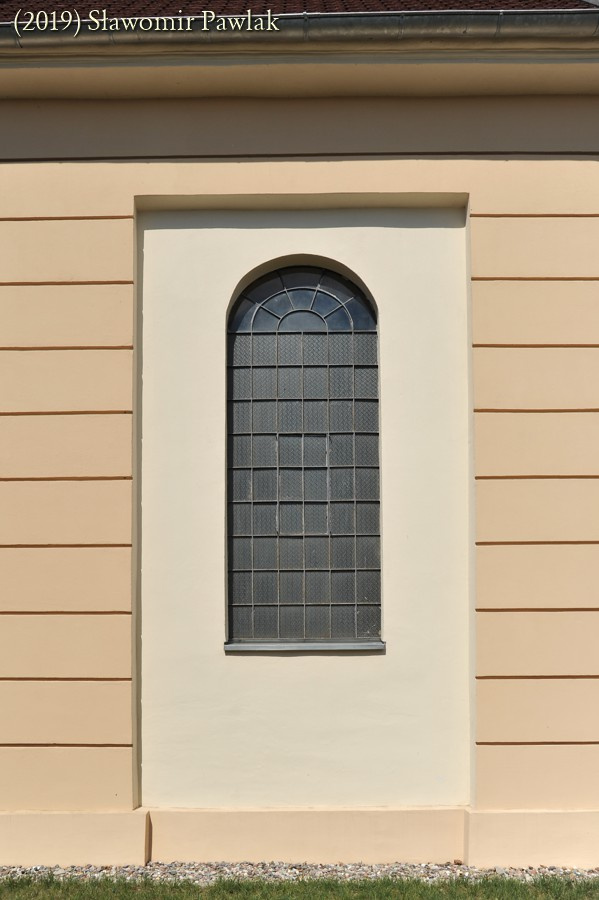 Otwory okienne korpusu nawowego otrzymały proste ościeża rozglifione do wnętrza ze skośnymi parapetami, zamknięte łukiem pełnym. Kolejne dwa okna oraz płytką wnękę o tym samym wykroju osadzono w ścianie apsydy. Środkowe partie elewacji bocznych wyodrębniono w formie pozornych ryzalitów zdobionych boniowaniem, ujętych po bokach lizenami. Okna tych ryzalitów umieszczono w prostokątnych płycinach.