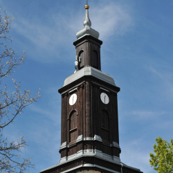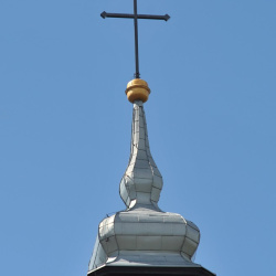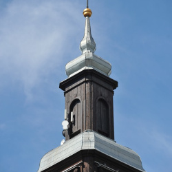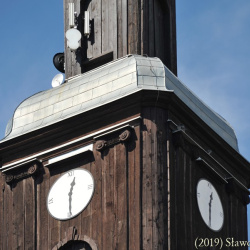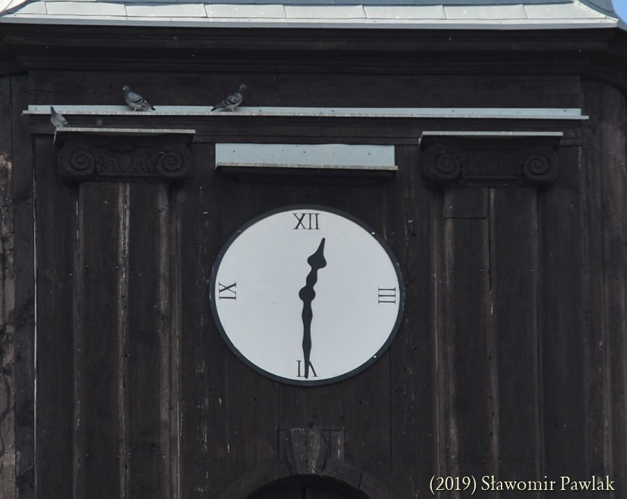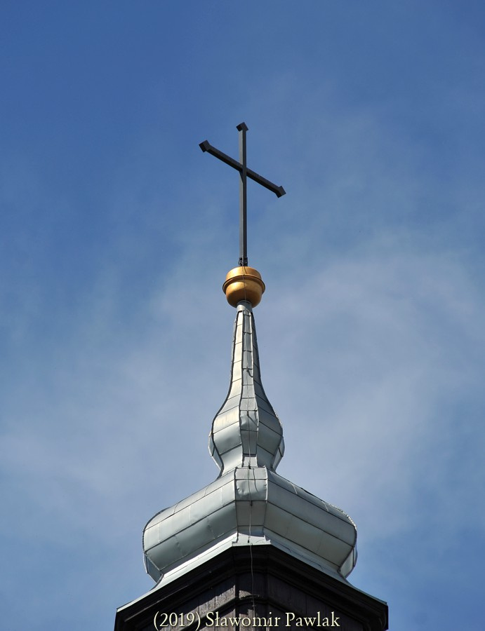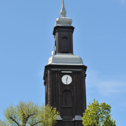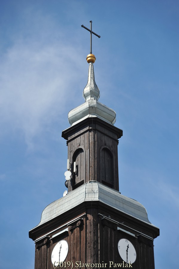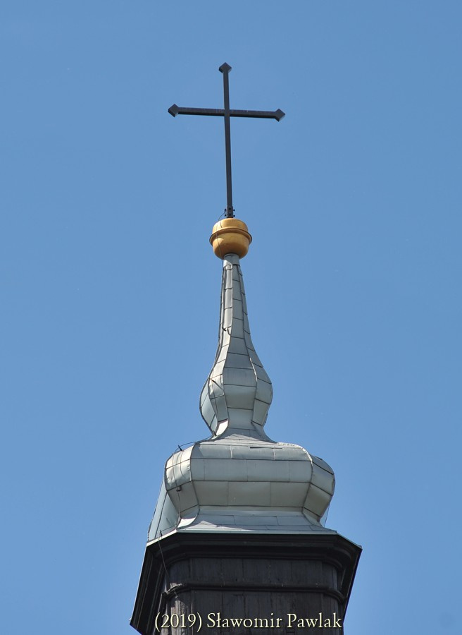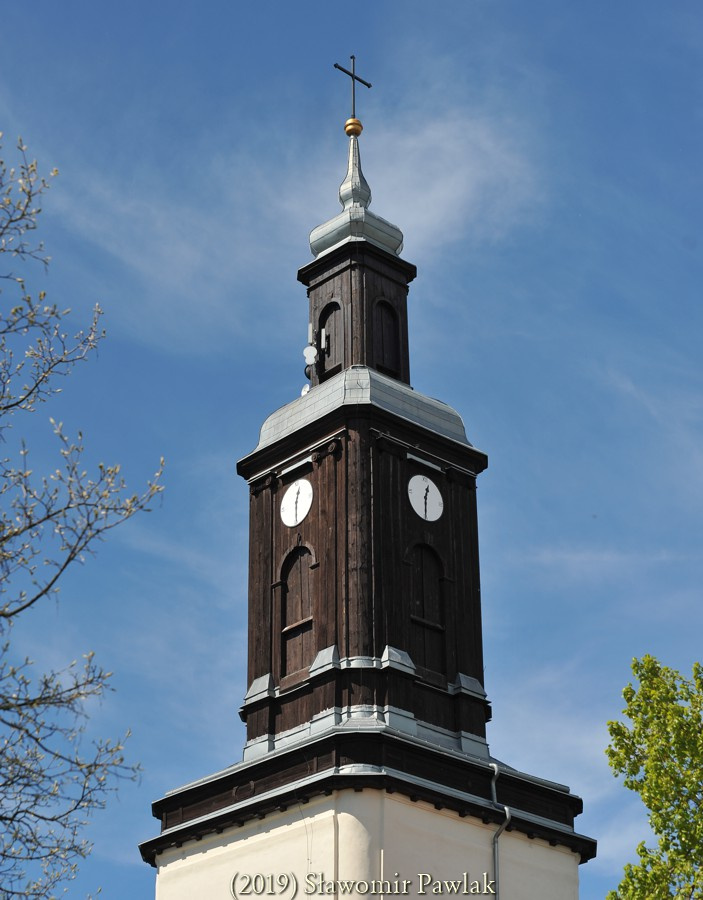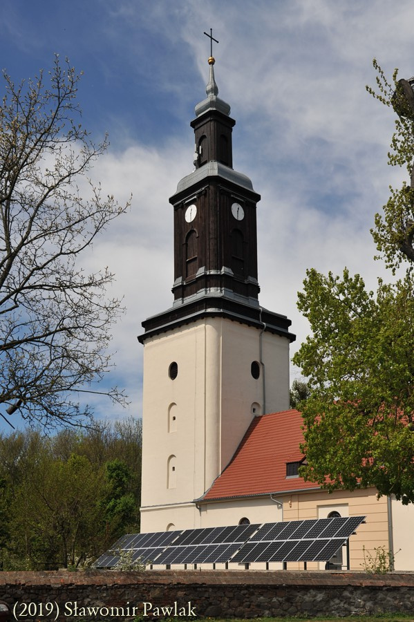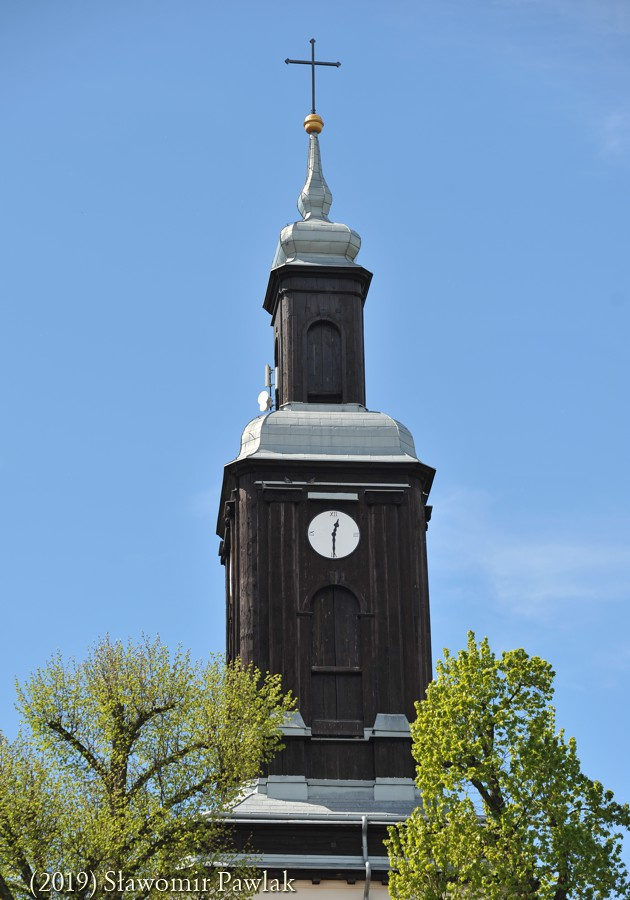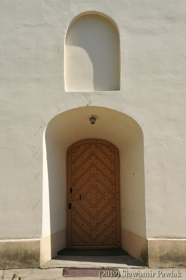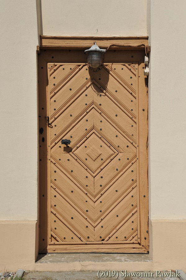 U podstawy wieży w ścianie zachodniej, wykonano otwór głównego wejścia do kościoła o prostych rozglifionych na zewnątrz ościeżach zamkniętych łukiem koszowym. Jednoskrzydłowe drzwi osadzono bardzo głęboko, po stronie wewnętrznej ościeża.
