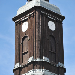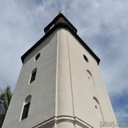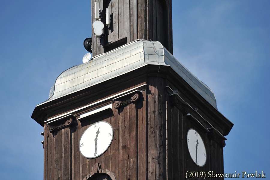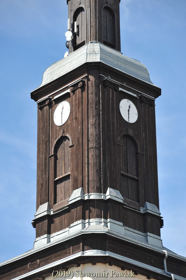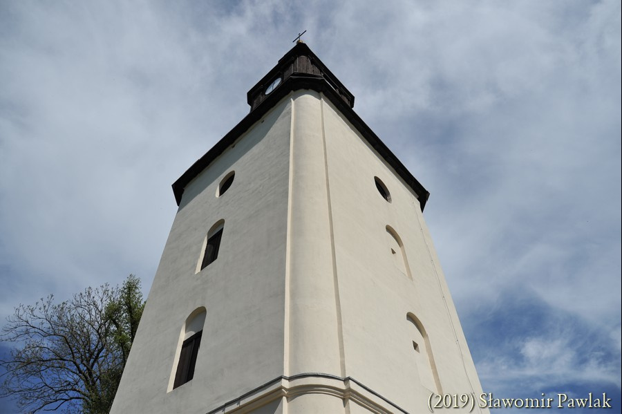 Wieża zachodnia, czterokondygnacyjna, otrzymała plan zbliżony do kwadratu (8,80 x 9,20). Ściany o zaokrąglonych narożach wymurowano z cegły i w całości otynkowano. Rozczłonkowano je gzymsem kordonowym oraz centralnie osadzonymi pojedynczymi oknami o półokrągłym zamknięciu odzwierciedlającymi podziały kondygnacyjne. Cześć z nich wtórnie zamurowano pozostawiając jedynie niewielkie prostokątne otwory. Ostanie okna w koronie ścian otrzymały wykrój eliptyczny. W górnej dwukondygnacyjnej, drewnianej części wieży, podziały zaakcentowano cokołem i belkowaniem, płytkimi lizenami zakończonymi jońskimi głowicami, ujmującymi półkoliście zamknięte otwory dzwonne. Ponad nimi umieszczono okrągłe tarcze mechanizmu zegarowego. Czterościenna latarnia zakończona została cebulastym hełmem krytym blachą z iglicą zakończoną kulą i krzyżem.