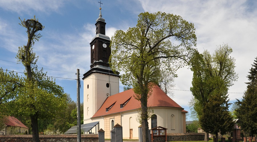 Kościół usytuowano w zachodnim skraju wiejskiej zabudowy, na miejscu wcześniejszej średniowiecznej budowli. Utrzymany w stylu klasycystycznym