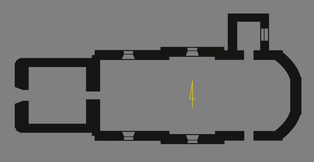 Korpus nawowy wymurowany w całości z cegły otrzymał plan prostokąta (24,60 x 10,80) zakończonego od wschodu owalną apsydą. Przestrzeń tą zamknięto tynkowanym płaskim stropem drewnianym oraz dachem dwuspadowym krytym dachówką ceramiczną ze stożkową połacią nad apsydą. W połaciach dachowych umieszczono po dwie proste lukarny doświetlające poddasze. Ściany zewnętrzne posiadające wyraźną płytką strefę cokołową w całości otynkowano i zwieńczono profilowanym gzymsem koronującym w formie wąskiego okapu. We wschodniej partii ściany południowej wykonano wtórnie wejście o prostokątnym ościeżu i drzwiach jednoskrzydłowych.
