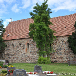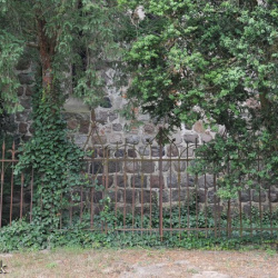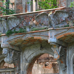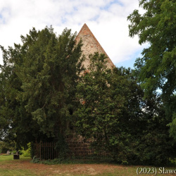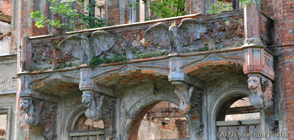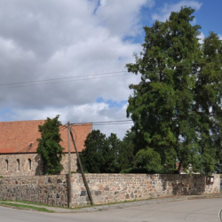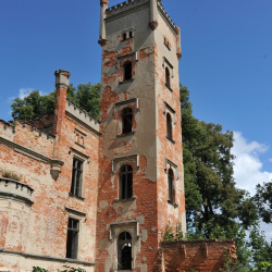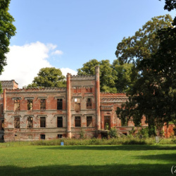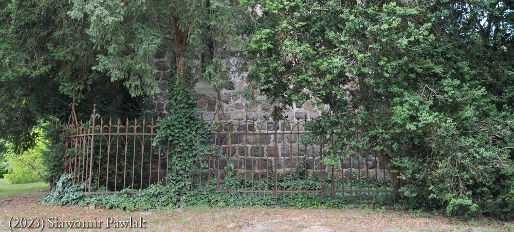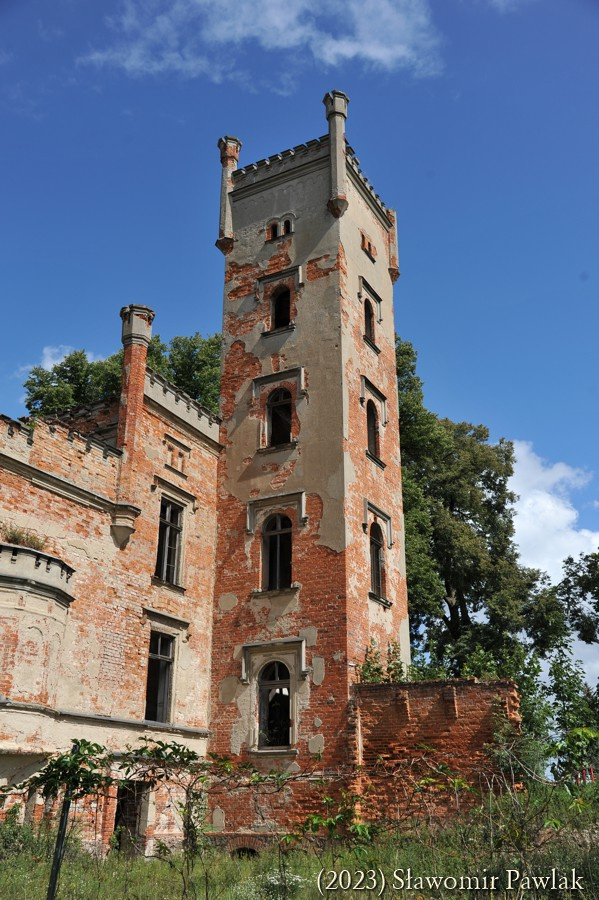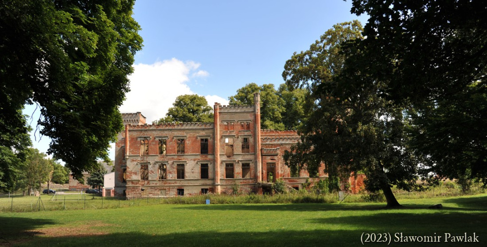 Niedaleko kościoła znajdują się ruiny dawnego zamku, o cechach fortyfikacyjnych, zbudowanego w 1861 roku przez Ferdinanda Neubatha dla Wilhelma Georga von Warburga. Po wspaniałej, asymetrycznej budowli wzniesionej w stylu normańskim lub tudorskim z charakterystycznymi wieżami i blankami pozostały jedynie mury zewnętrzne. Założenie parkowe powstało po 1826 roku według planów Petera Josepha Lenné. Obecnie jest własnością gminy. W sąsiedztwie pałacu i parku zachowały się pozostałości zabudowań folwarcznych; gorzelni z młynem parowym, stajni i stodoły oraz dom dozorcy.