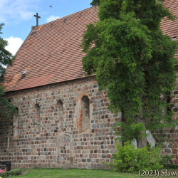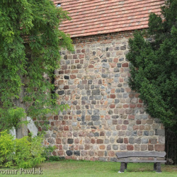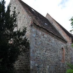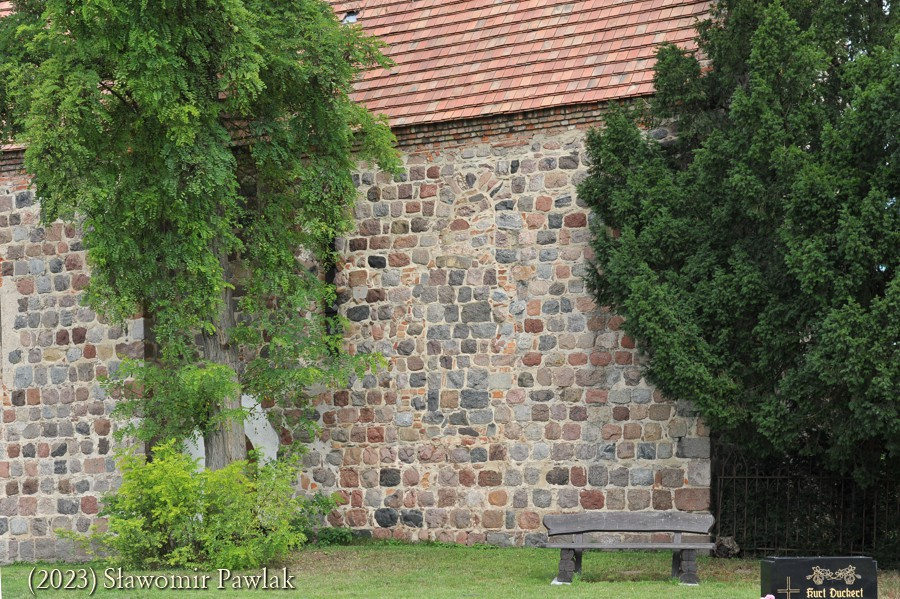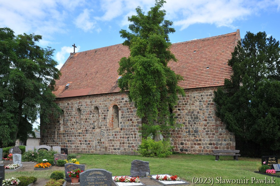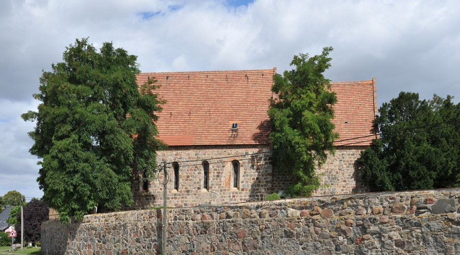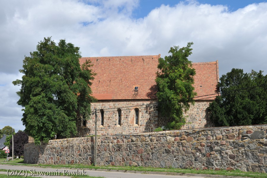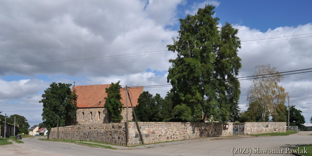 Kościół usytuowano we wschodnim skraju wiejskiej zabudowy, na sztucznym wyniesieniu otoczonym kamiennym murem. Świątyni nadano charakterystyczny dla wiejskiej architektury sakralnej Pomorza Zachodniego układ, złożony z prostokątnej nawy (14,5x10 m) oraz wyodrębnionego prostokątnego prezbiterium 8,5x7 m, od wschodu prosto zamkniętego.