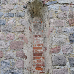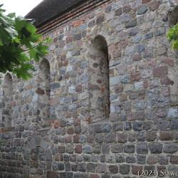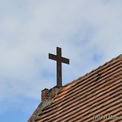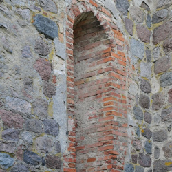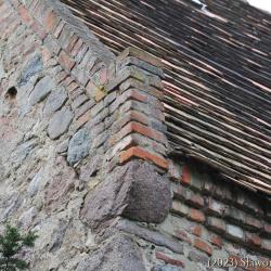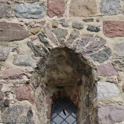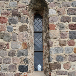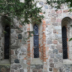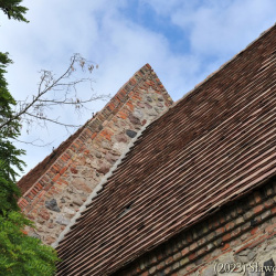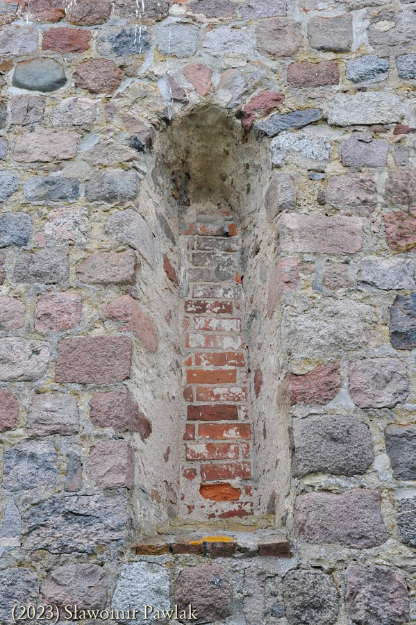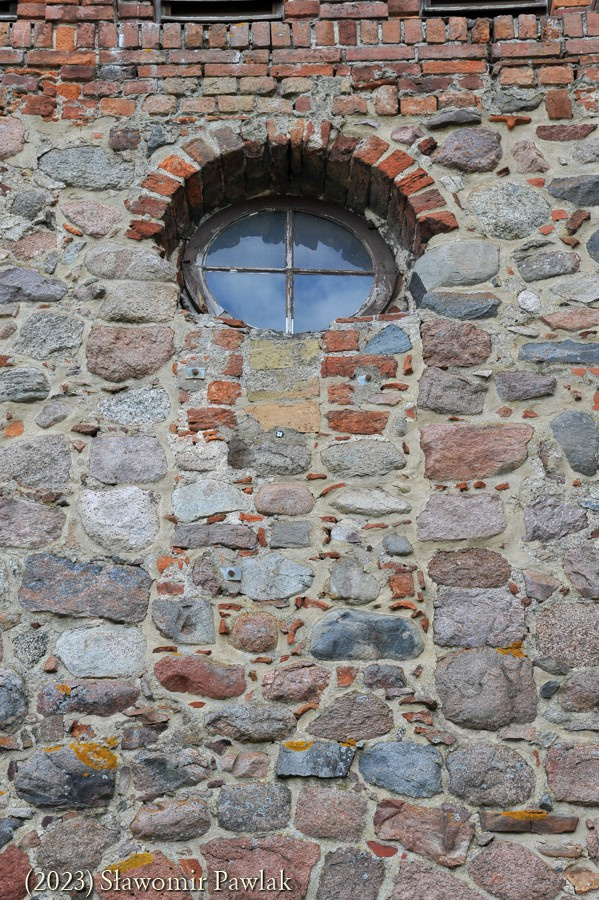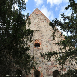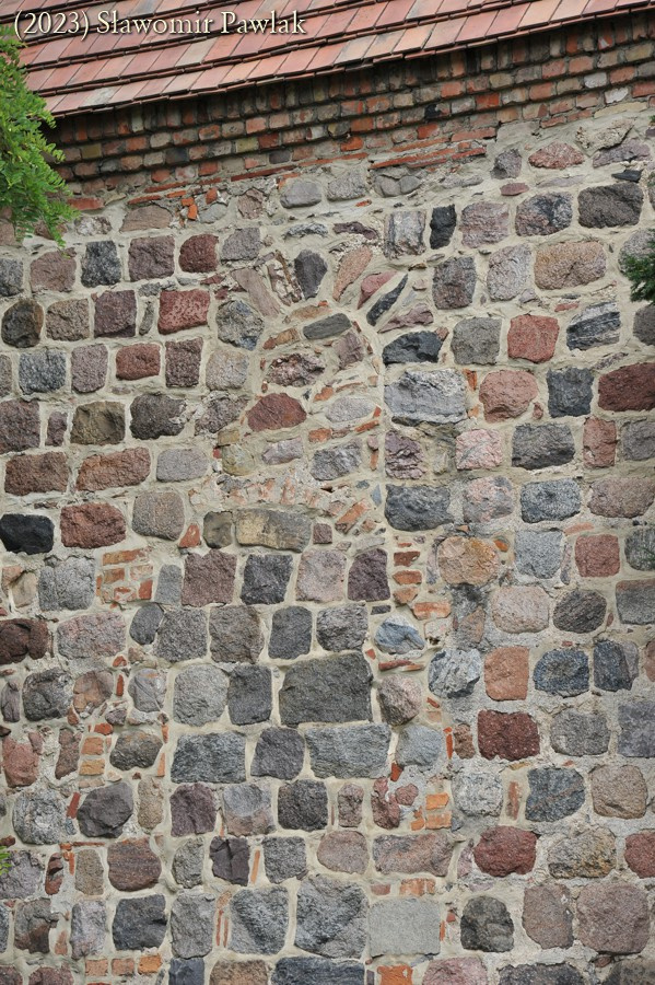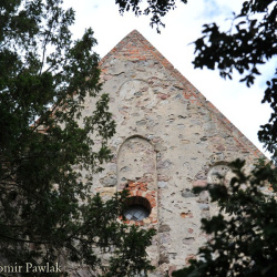 Najbardziej dekoracyjnie opracowano wschodnią ścianę szczytową. W centrum osadzono zespół trzech okien o obustronnie rozglifionych ościeżach zamkniętych ostrołukiem i skośnymi parapetami. Prawdopodobnie środkowe okno było nieco wyższe od skrajnych. Szczyt, w całości kamienny, rozczłonkowano grupą trzech płytkimi blend w układzie piramidalnym i ostrołukowym wykroju. W wyższej środkowej blendzie wykonano wtórnie niewielki okulus w ceglanym obramieniu.