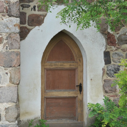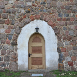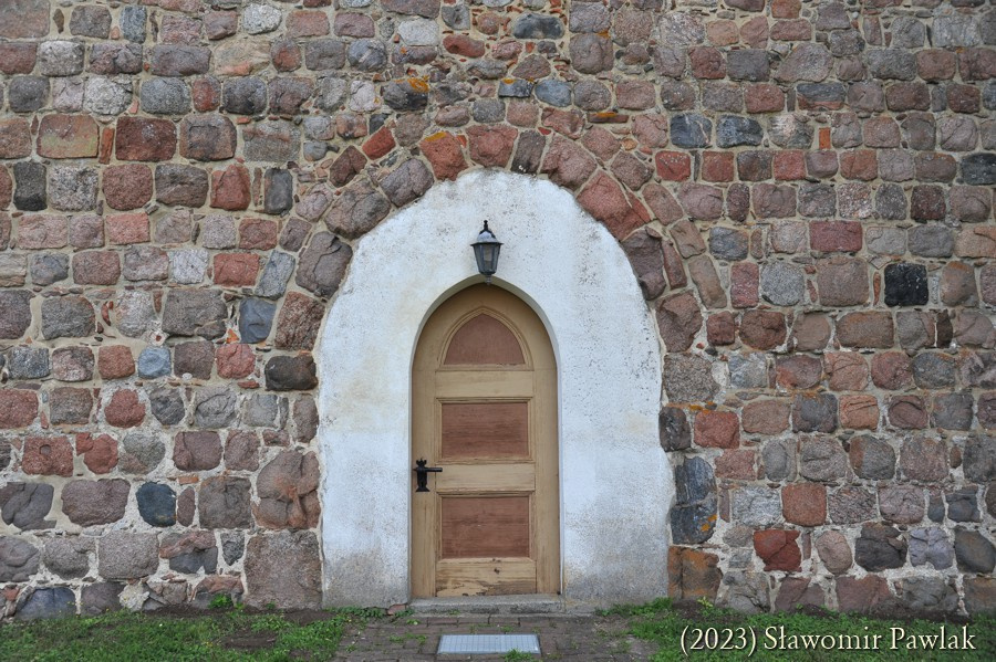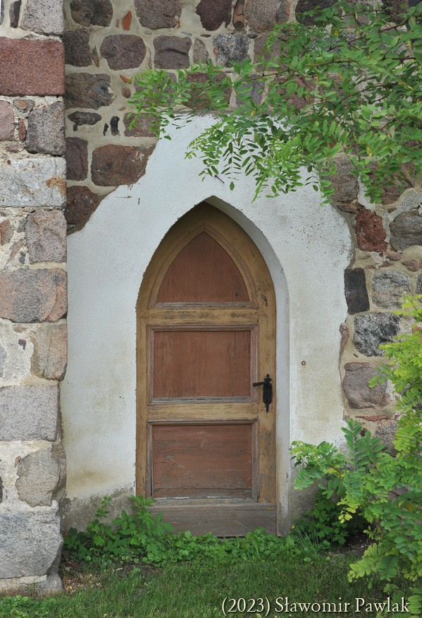 Do wnętrza kościoła wiodły cztery portalowe wejścia. Portal zachodni usytuowano na osi kościoła. Dwuuskokowe ościeże zamknięto delikatnym ostrołukiem, z dodatkowym wieńcem kwadr w archiwolcie. Po zniszczeniach został przebudowany i pomniejszony. Portale w ścianach północnej i południowej nawy, otrzymały jednouskokowe ościeża zamknięte ostrołukiem z elementem zwornikowym i dodatkowym wieńcem kwadr w archiwolcie. W późniejszym okresie zostały zamurowane. Ostatni z portali, tak zwany kapłański, usytuowano w zachodnim skraju południowej ściany prezbiterium. Zapewne posiadał identyczną formę jak portale w nawie. W bliżej nieokreślonym czasie został przemurowany. Obecnie, ostrołukowo zamknięte ościeża pokryto zaprawą tynkarska. Jednoskrzydłowe drzwi strzegą dostępu do wnętrza.