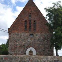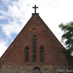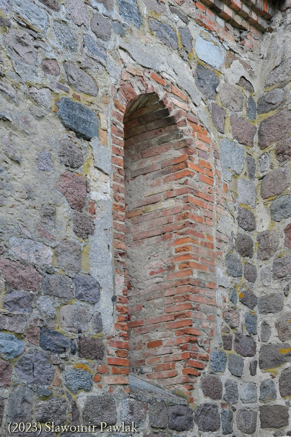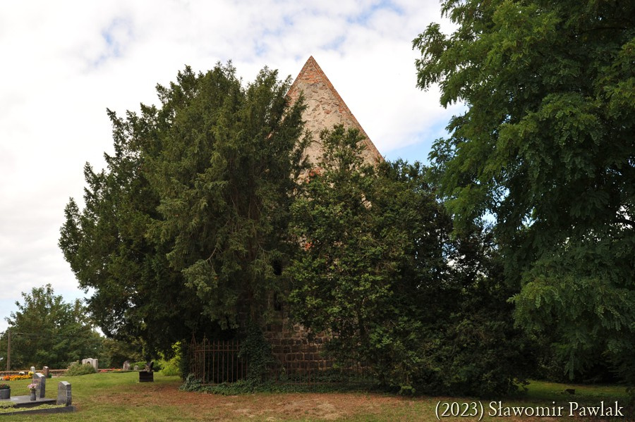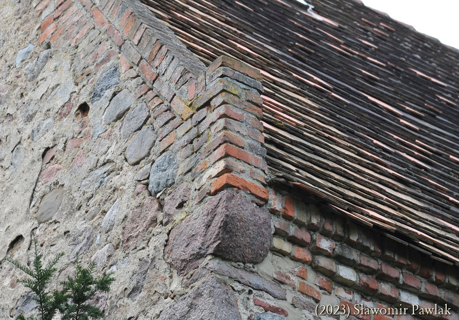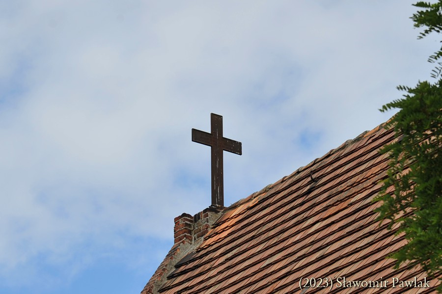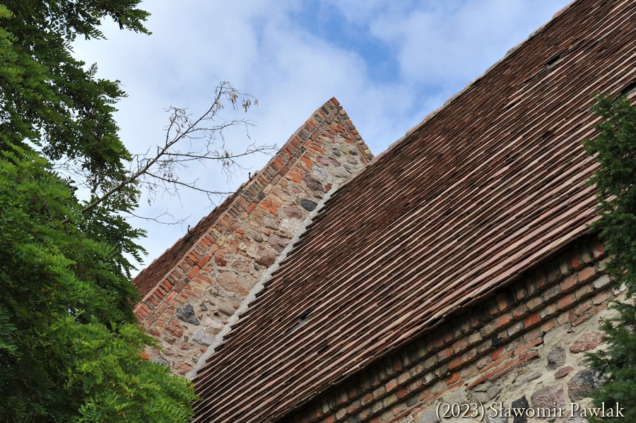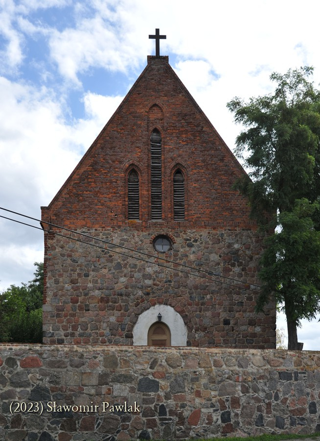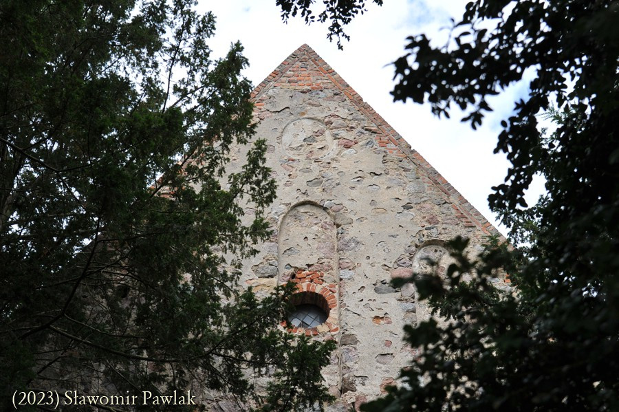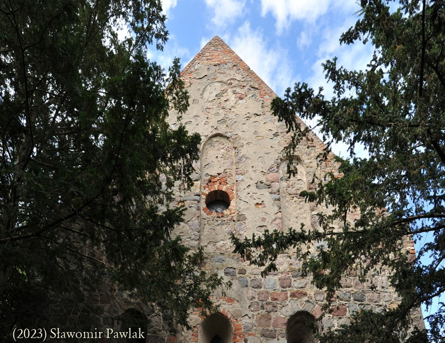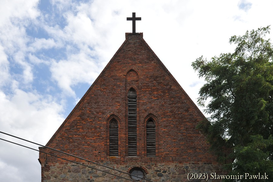 Szczyt zachodni został na nowo wymurowany cegłą maszynową po roku 1945. W jego osi wykonano trzy otwory w układzie piramidalnym o wąskich uskokowych ościeżach zamkniętych ostrołukiem. Przesłonięte zostały żaluzjami dla lepszego rozchodzenia się dźwięku dzwonu zawieszonego w tej części poddasza (dawnej wieży). Poniżej zachował się ślad po płytkich blendach, prawdopodobnie w liczbie trzech. Obecnie dobrze widoczne jest kamienne ościeże blendy środkowej z zamurowanym niewielkim prostokątnym otworem. W jego miejsce wykonano wtórnie obecne okrągłe okno.