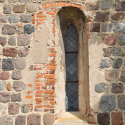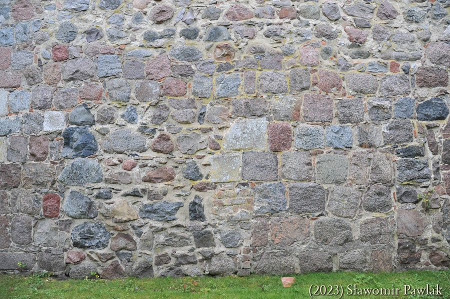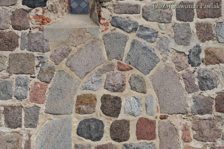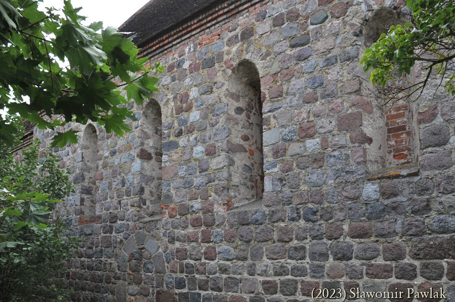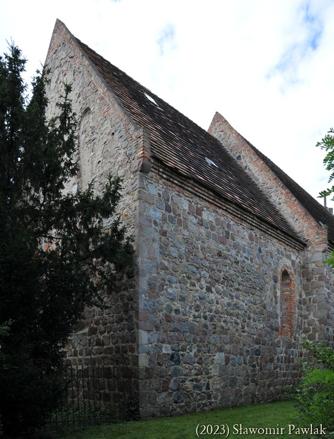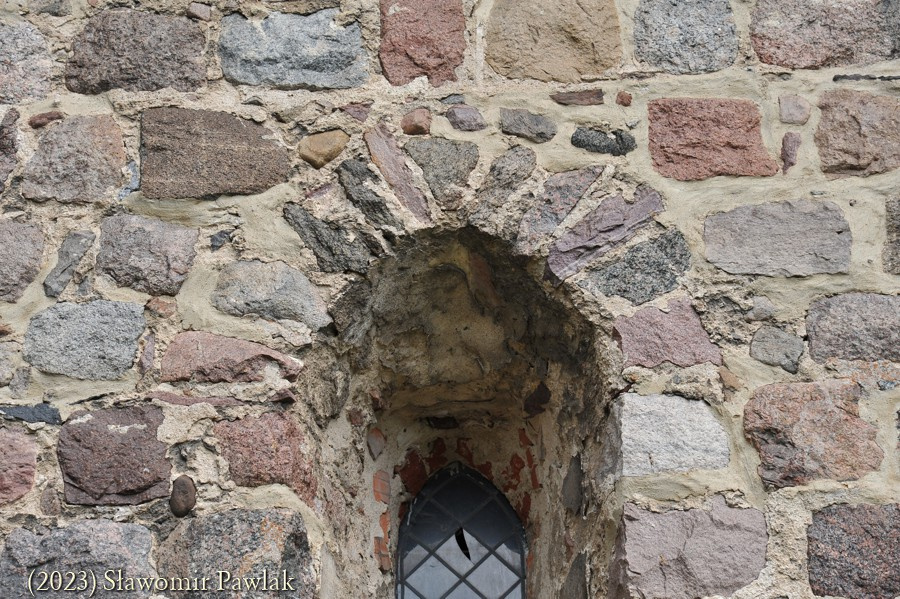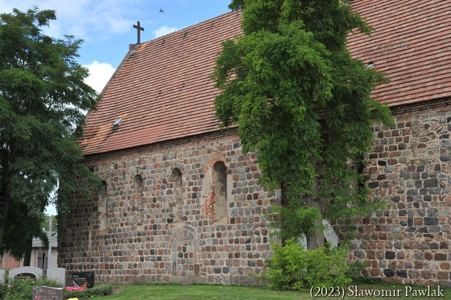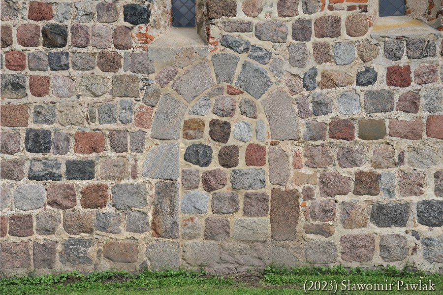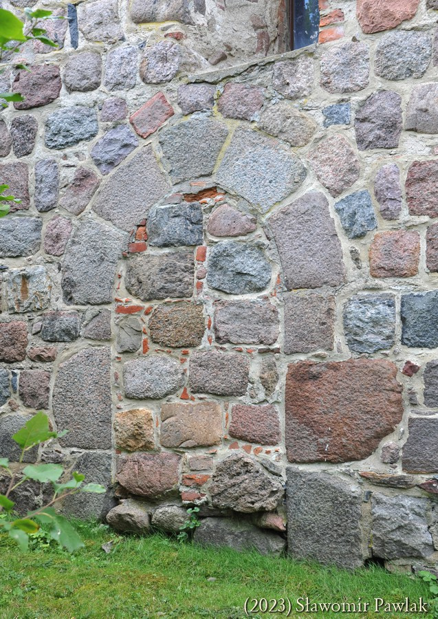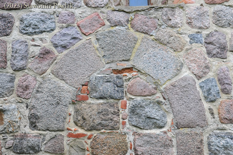 Wszystkie ściany kościoła, posadowione na kamiennym fundamencie wymurowano z dobrze obrobionych kwadr granitowych łączonych zaprawą wapienną, ułożonych w regularne poziome warstwy. Dokładniej opracowano kwadry tworzące narożniki ścian oraz ościeża portali i okien. Przestrzenie nawy i prezbiterium oddzielono ostrołukiem tęczowym. Wnętrze zamknięto stopami belkowymi i dwuspadowymi dachami krytymi dachówką ceramiczną.