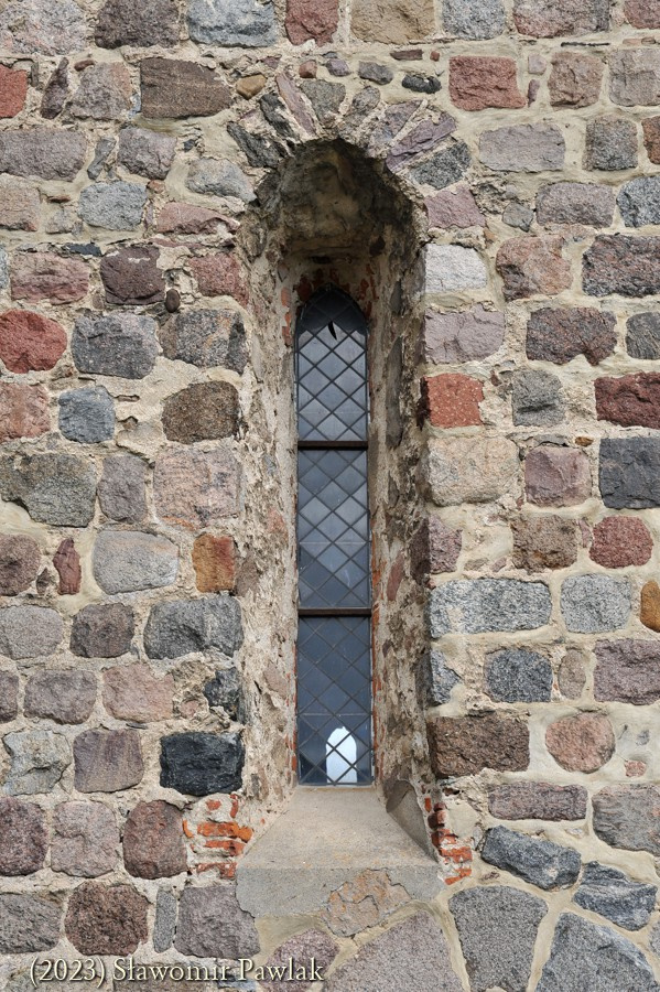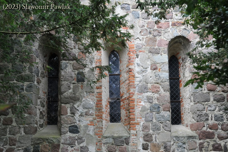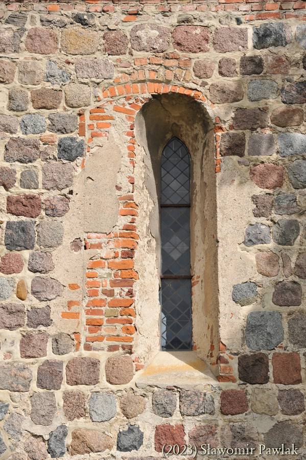 Okna zachowały w większości pierwotną formę, nieliczne tylko przemurowano bądź zamurowano. Osadzono je symetrycznie, na przestrzał, po cztery w ścianach nawy oraz jedno w ścianie północnej i dwa w ścianie południowej prezbiterium. Wąskie, proste, obustronnie rozglifione ościeża zamknięto ostrołukiem.