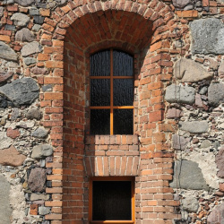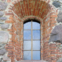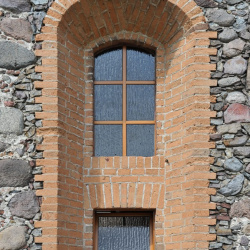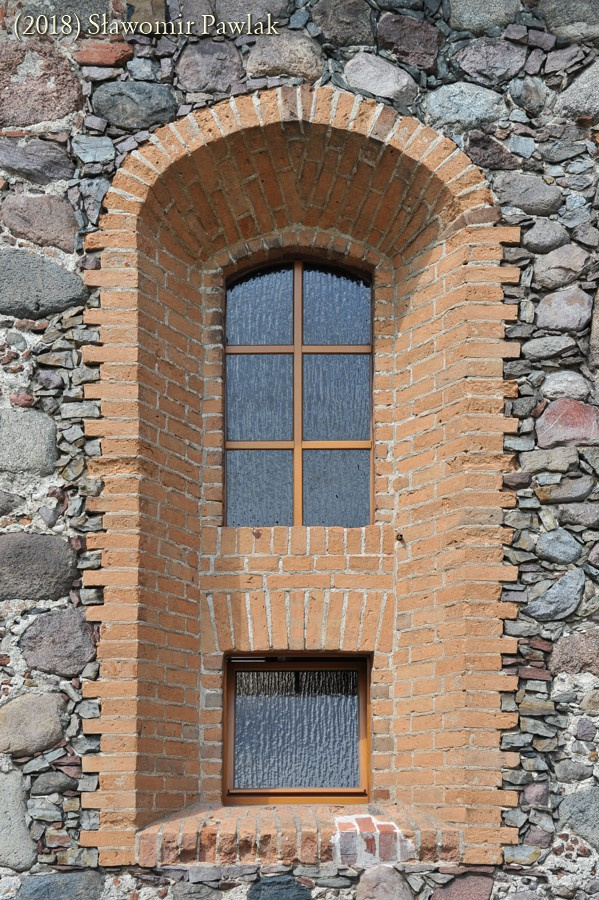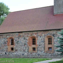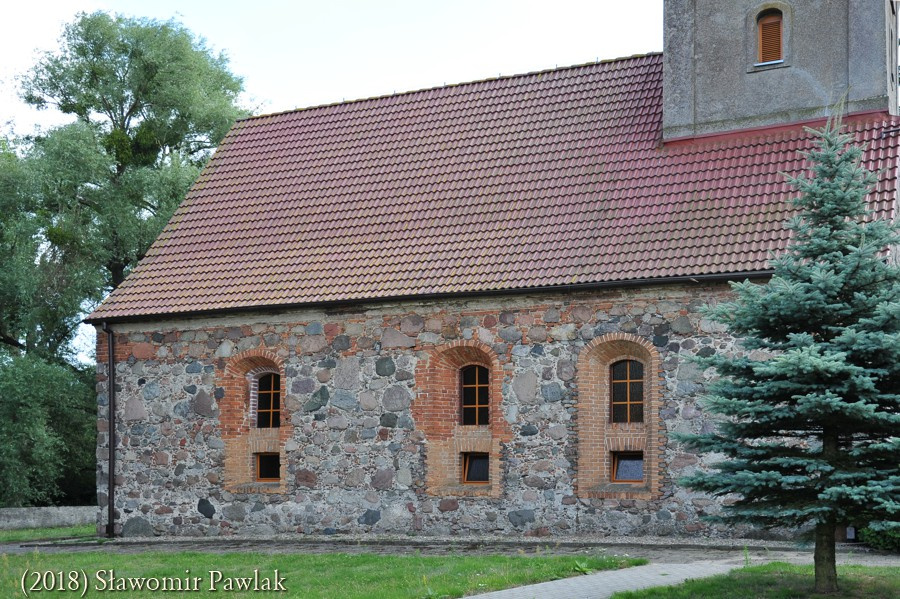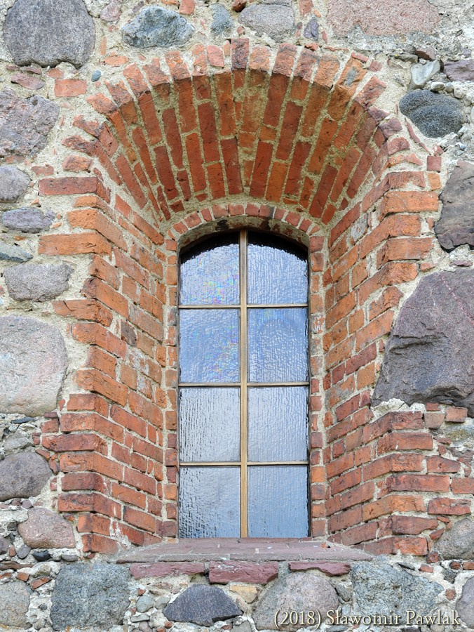 Podczas XVIII wiecznej przebudowy kościoła przemurowano okna osadzone symetrycznie, na przestrzał, po trzy w ścianach północnej i południowej oraz dwa w elewacji wschodniej. Ceglane ościeża zgodnie z barokową stylizacją silnie rozglifiono na zewnątrz i zamknięto łukami odcinkowymi oraz skośnymi parapetami. Okna w ścianach północnej i południowej znacznie wydłużono. W XIX wieku ościeża niektórych okien wymurowano na nowo i dodatkowo przedzielono.