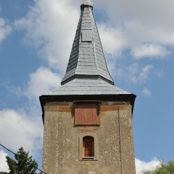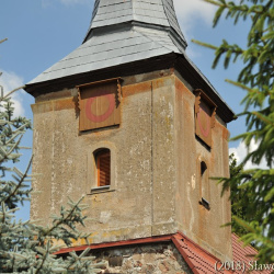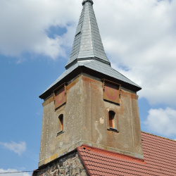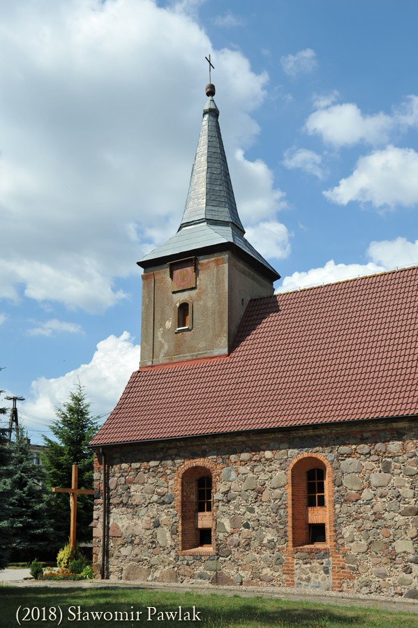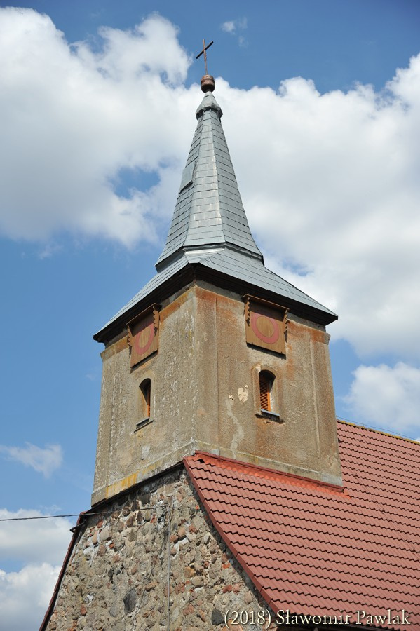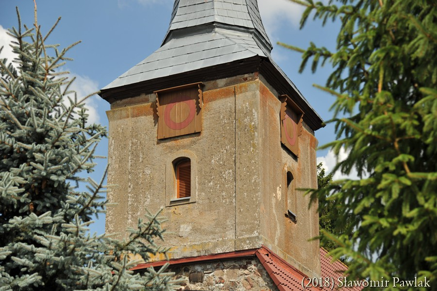 Wieżę o planie kwadratu nadbudowano nad partią zachodnią kościoła, opierając konstrukcję szkieletową na ścianie szczytowej i więźbie dachowej. Jednoprzestrzenne wnętrze zamknięto dwudzielnym szpiczastym hełmem krytym blachą. Zwieńczono go kulą i krzyżem. W trzech ścianach wieży osadzono centralnie po jednym niewielkim oknie o prostym ościeżu zamkniętym łukiem odcinkowym. Światło okna przesłonięto drewnianymi żaluzjami. Ponad oknami umieszczono kwadratowe tarcze zegarowe zaopatrzone w niewielki okap.