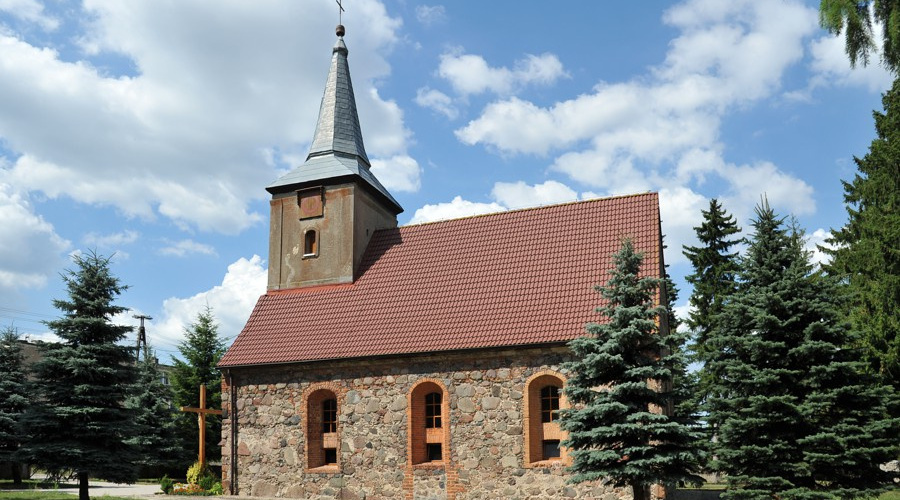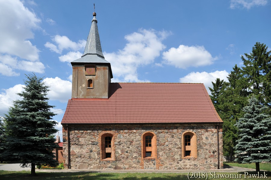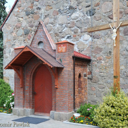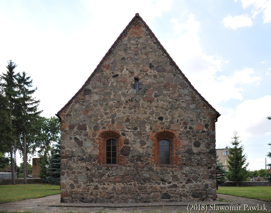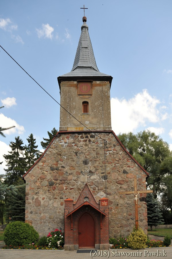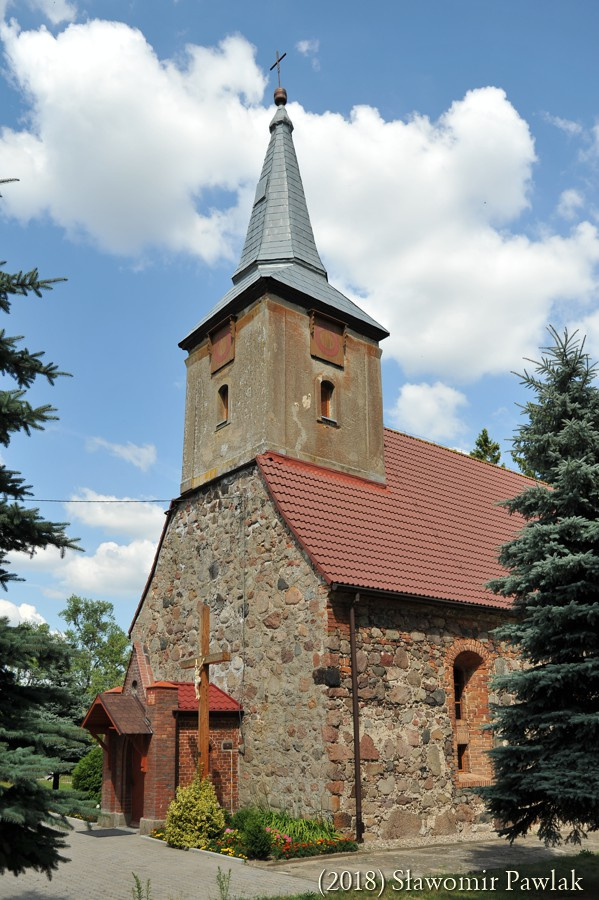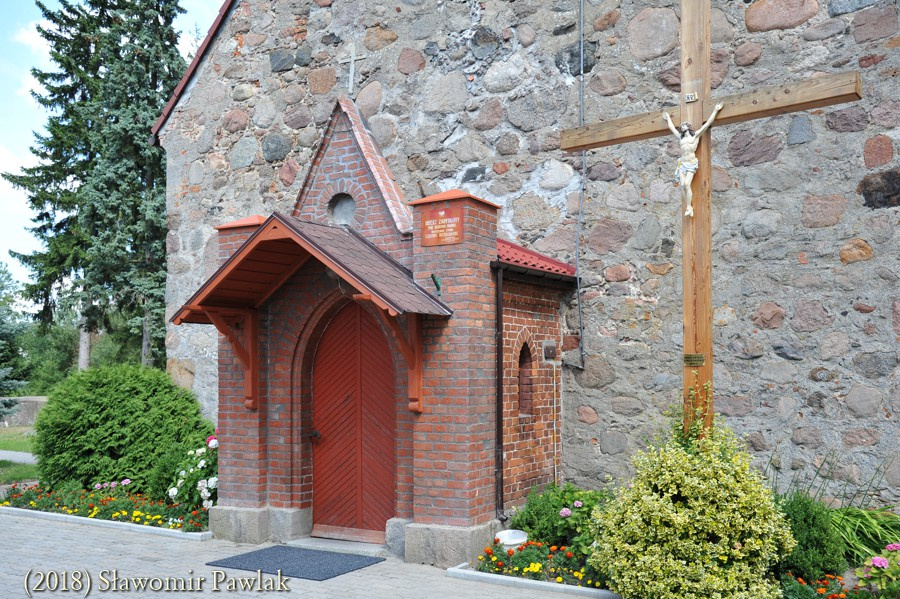 Portale wejściowe usytuowano w ścianie południowej i zachodniej. Relikty portalu południowego pozostały widoczne w postaci ceglanego ościeża. W okresie przebudowy kościoła portal ten zamurowano, a w miejscu ostrołuku osadzono parapet okna. Portal zachodni o dwuuskokowym ceglanym ościeżu zamknięto również ostrołukiem. W XIX wieku obudowano go płytką kruchtą o neogotyckiej formie z dekoracyjną wimpergą i ostrołukowym wejściem. W ścianach bocznych wykonano niewielkie okna o ostrołukowym wykroju. Przestrzeń tą zamknięto niskim dachem dwuspadowym krytym dachówką. W ostatnich latach nad wejściem do kruchty dodano wątpliwej urody drewniany okap.