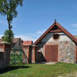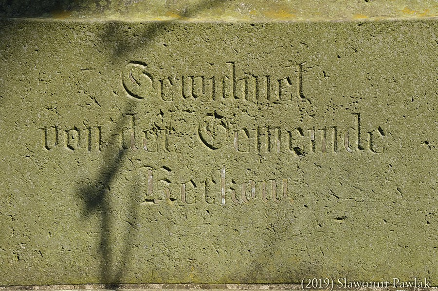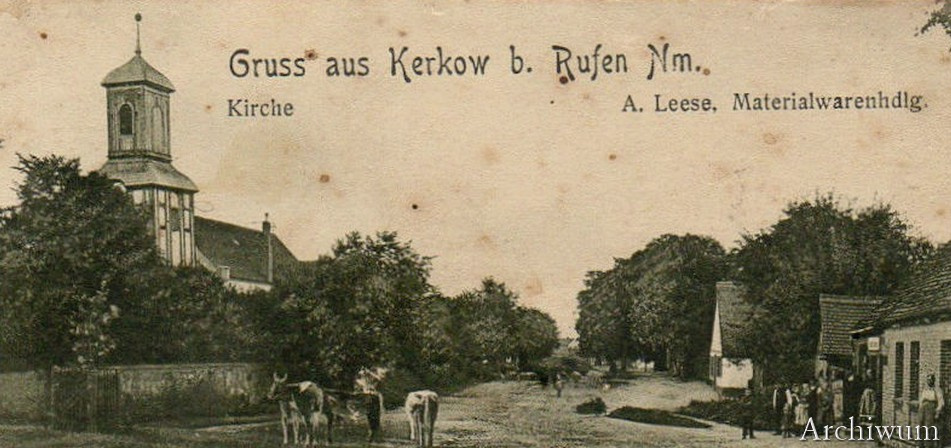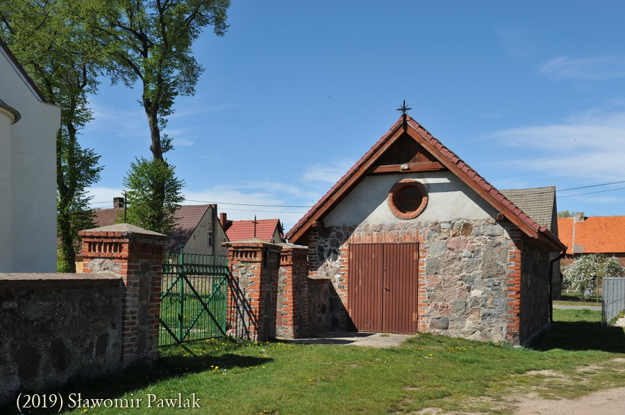 Plac kościelny otoczony został niskim kamiennym murem z bramkami i furtkami od wschodu i zachodu oraz furtką od północy. Pełnił funkcję lokalnej nekropolii do chwili utworzenia nowego cmentarza usytuowanego po zachodniej stronie miejscowości. Przy wschodniej bramie, zapewne w drugiej połowie XIX wieku, w ciągu muru kościelnego wzniesiono niewielki prosty salowy budynek pełniący zapewne funkcję kaplicy przedpogrzebowej. W północno-zachodnim skraju placu zachował się pomnik poświęcony poległym na frontach I wojny światowej. Główne płyty z nazwiskami żołnierzy zostały usunięte, na cokole dostrzec można obustronnie identyczną inskrypcję „Gewidmet von der Gemeinde Kerkow” (Dedykowany przez gminę Kerkow).