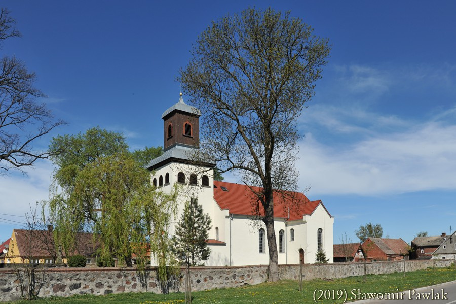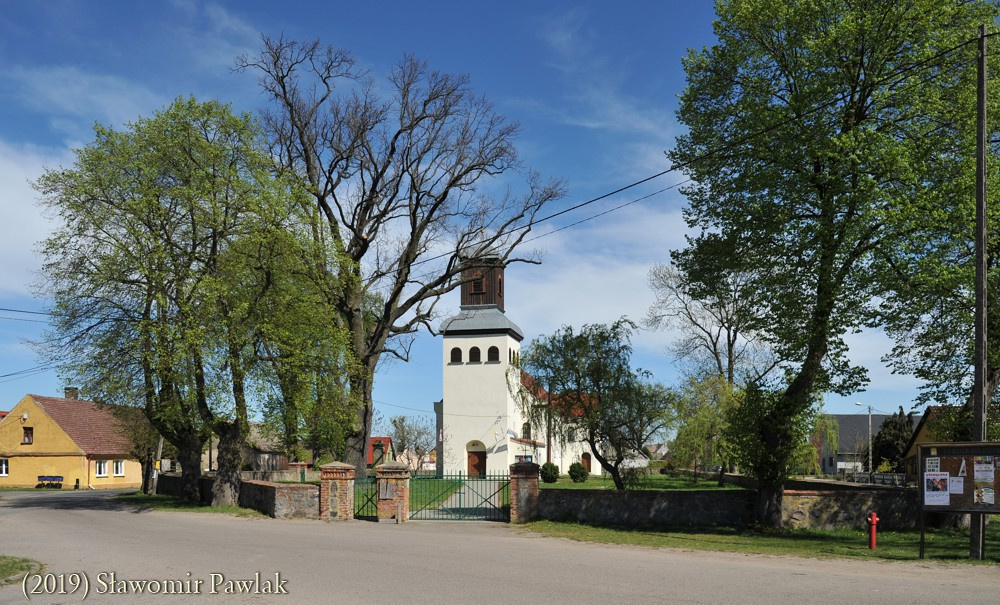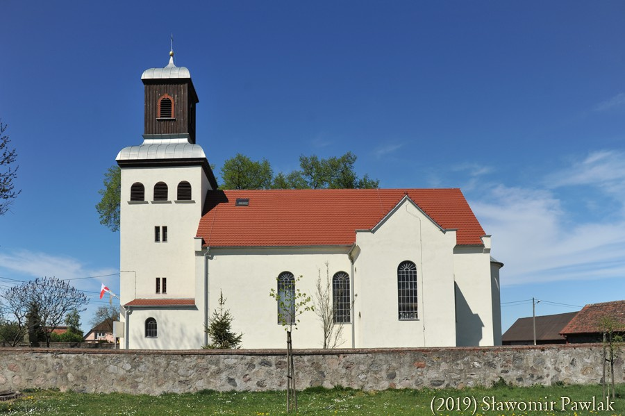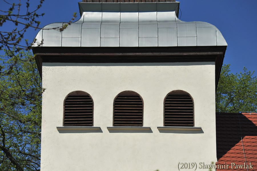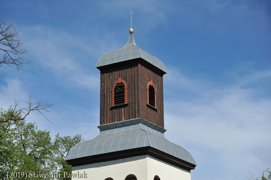 Do ściany zachodniej kościoła dobudowano wieżę o planie kwadratu. Na ceglanej podstawie oparto nadbudowę o konstrukcji szkieletowej wypełnionej cegłą. W podstawie osadzono portal o prostym ościeżu zamkniętym łukiem pełnym. Zapewne w późniejszym okresie zamurowano półkoliste nadświetle. Ściany północną i południową rozczłonkowano oknami, u dołu pojedynczym o półokrągłym zamknięciu, wyżej oknami szczelinowymi o biforyjnym układzie. W koronie trzech ścian wykonano triady okien o półokrągłym wykroju przesłoniętych drewnianymi żaluzjami dla lepszego rozchodzenia się dźwięku dzwonów. Całość zamknięto drewnianym hełmem krytym blachą, zwieńczonym iglicą z kulą i krzyżem. W czworobocznej latarni osadzono okna o półokrągłym wykroju przesłonięte żaluzjami.