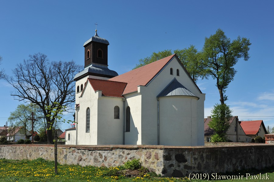 Do wschodniej ściany kościoła dobudowano półokrągła bezokienną apsydę z murowaną konchą, zamkniętą dachem ostrosłupowym krytym blachą. Od strony wewnętrznej podkreślono ją profilowaną opaską.