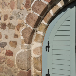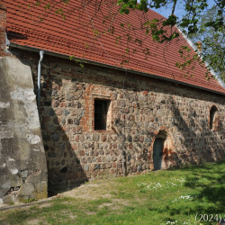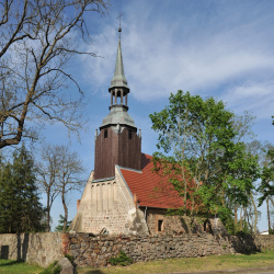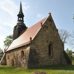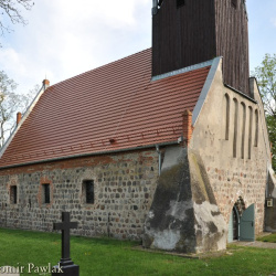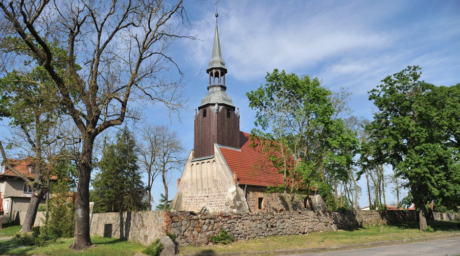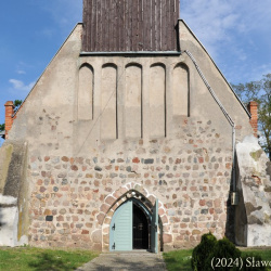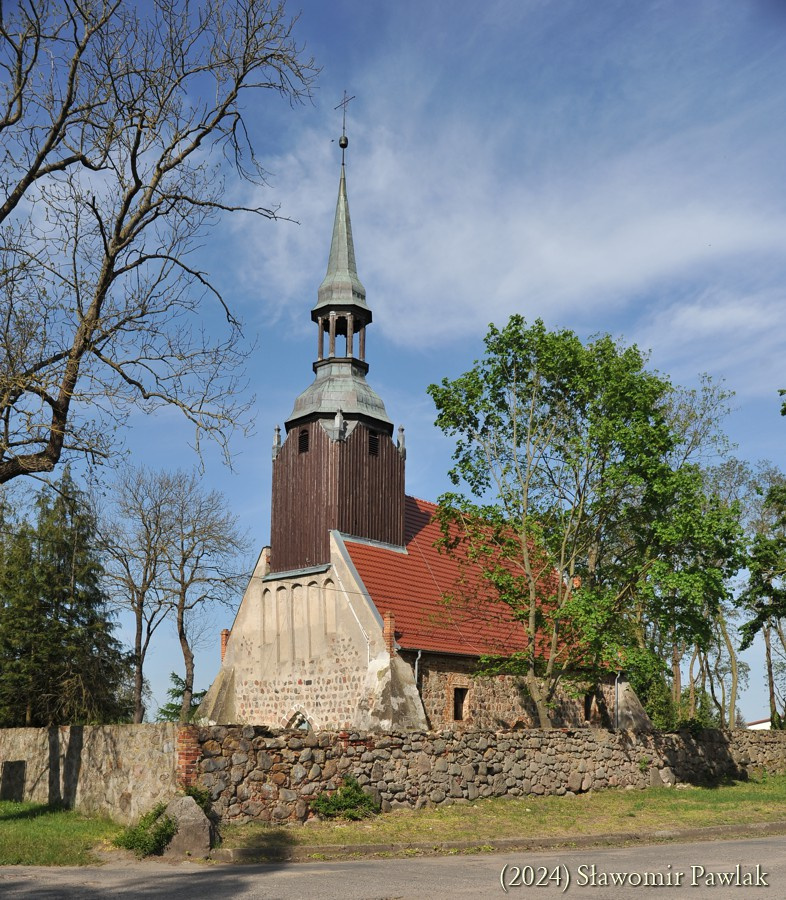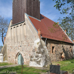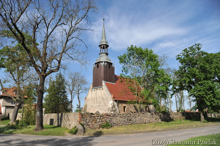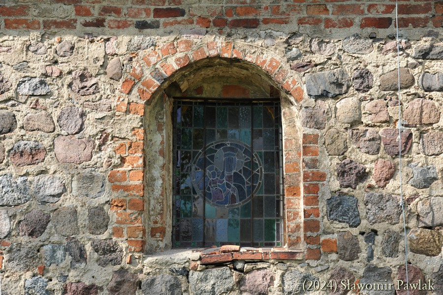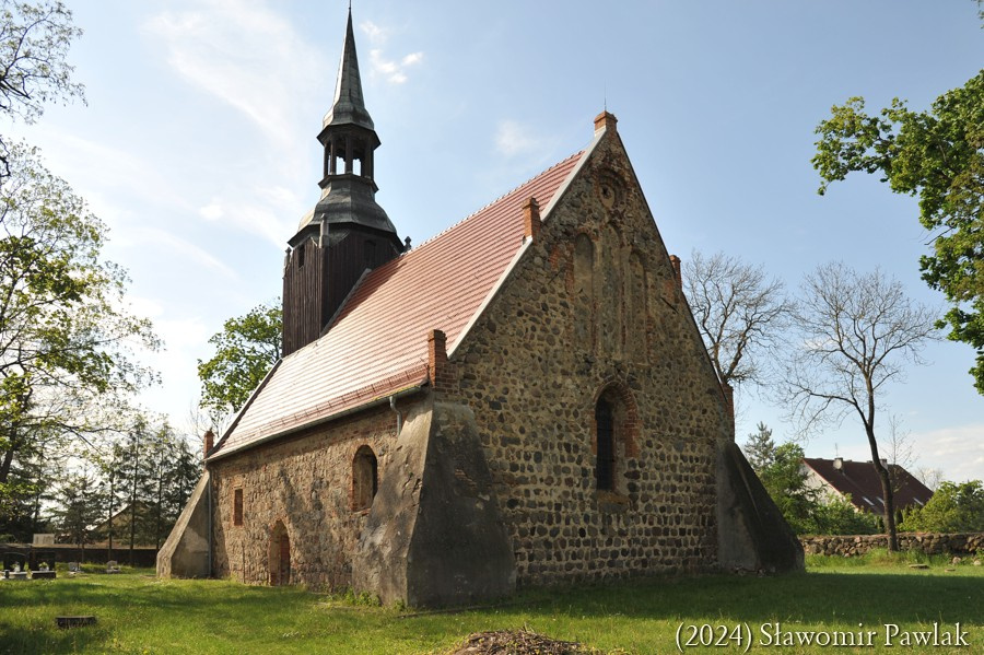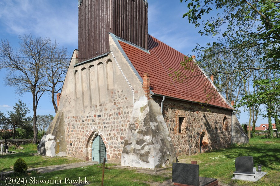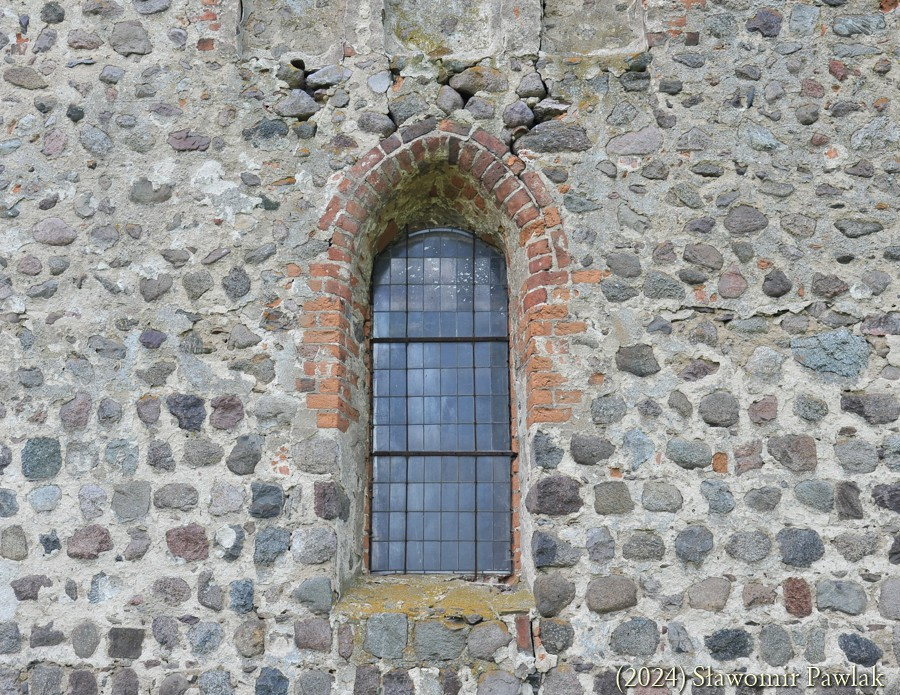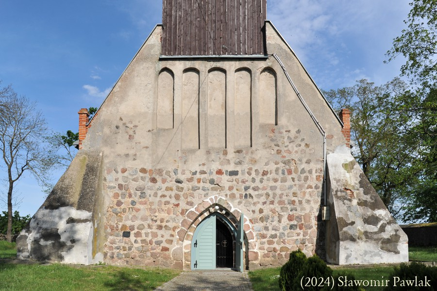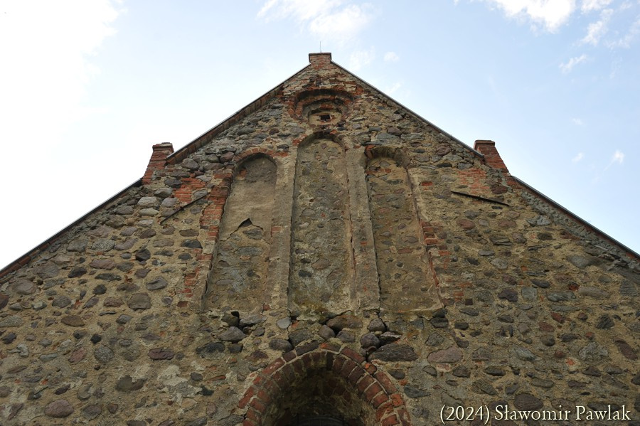 Wszystkie ściany posadowione na kamiennym fundamencie wymurowano z przyciosanych kamieni polnych ułożonych w regularne warstwy (19 warstw). Z kamienia wymurowano również szczyty zdobione niewielkimi sterczynami kostkowymi na krawędziach oraz płytkimi ostrołukowymi blendami w ceglanym obramieniu. Szczególnie dekoracyjnie potraktowano szczyt wschodni z trzema blendami w układzie piramidalnym. Ponad nim umieszczono okulus o rozglifionym na zewnątrz uskokowym ościeżu. Szczyt zachodni zredukowano w górnej partii i osadzono na nim konstrukcję wieży.