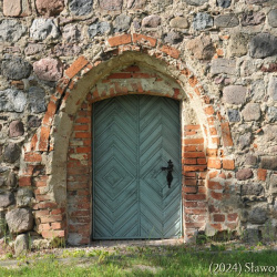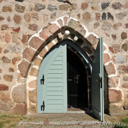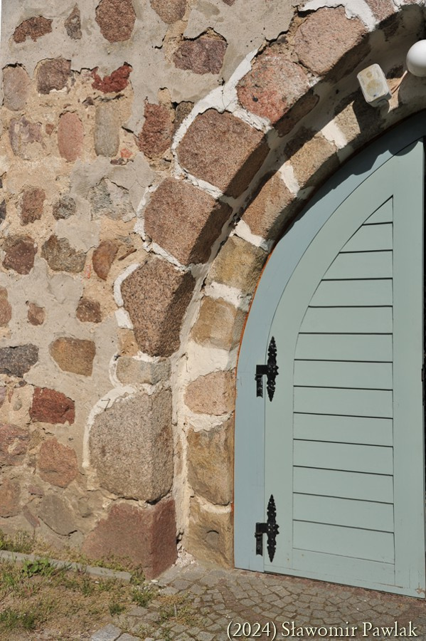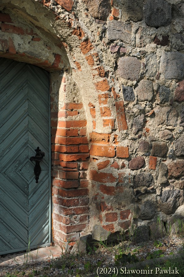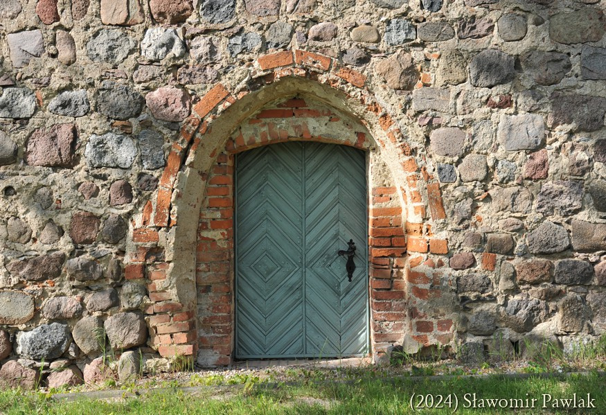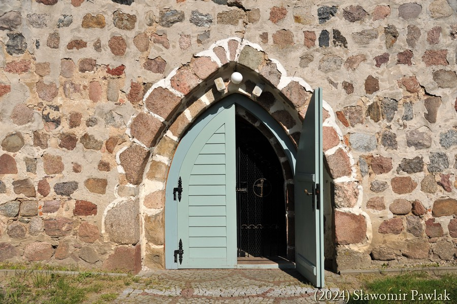 Wejścia do wnętrza świątyni usytuowano pośrodku ściany zachodniej oraz południowej. Portal zachodni otrzymał trójuskokowe ościeże wykonane z kwadr granitowych, zamknięte wyraźnym ostrołukiem. Współcześnie wykonane dwudzielne drzwi otrzymały ten sam wykrój. Portal południowy o ostrołukowym wykroju przemurowano w późniejszym okresie. Otrzymał dwuuskokowe ceglane ościeże w partii archiwolty profilowane.