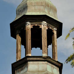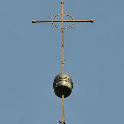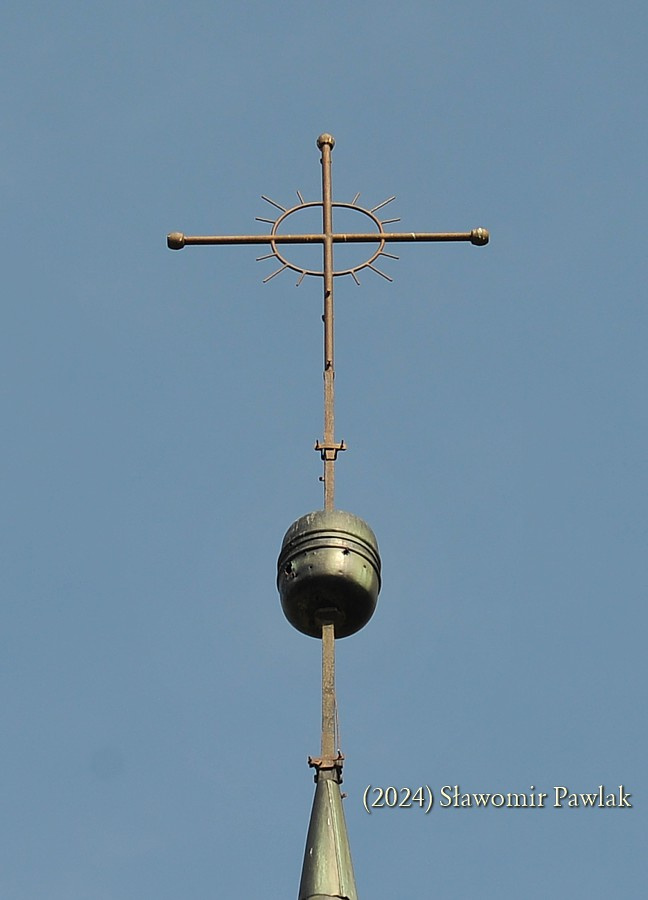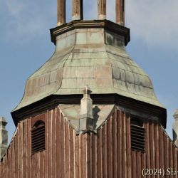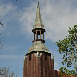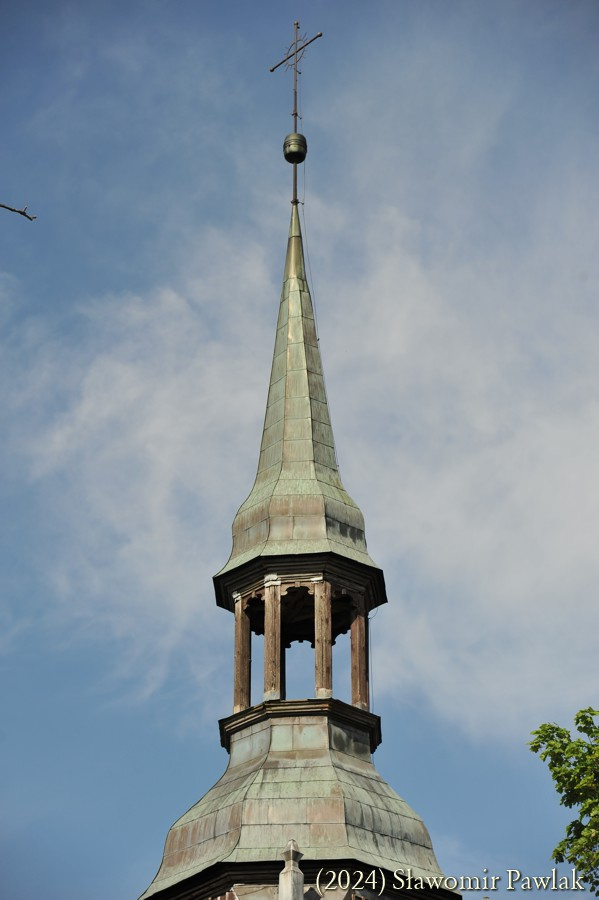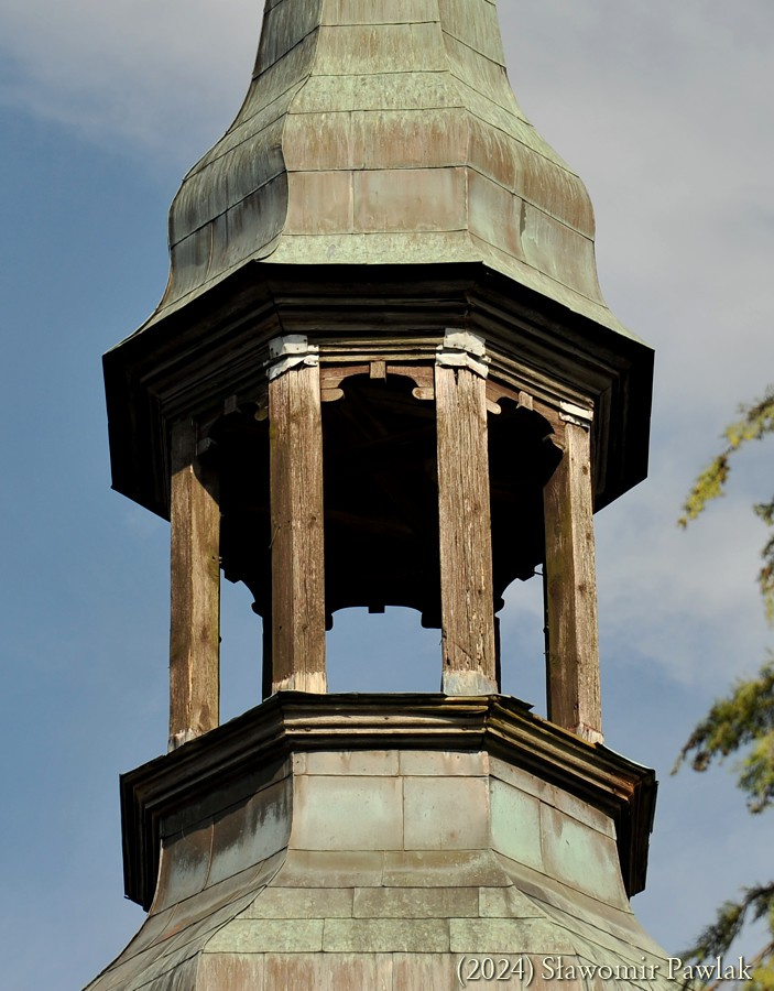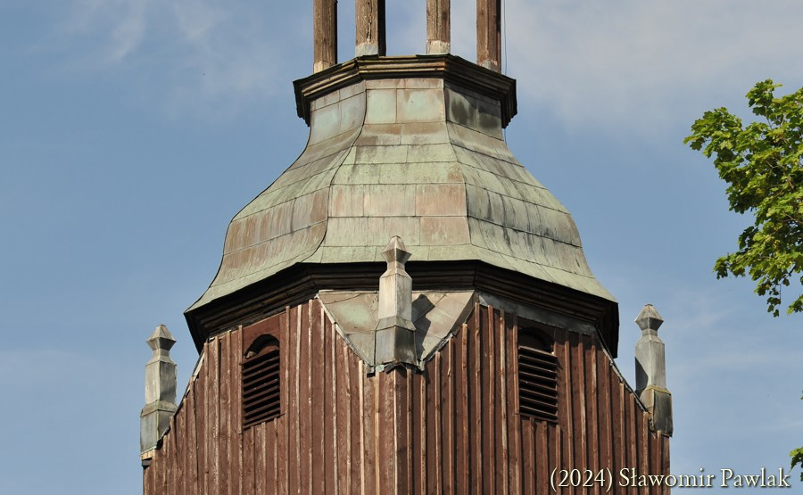 W pierwszej połowie XVIII wieku, nad zachodnią patią kościoła wzniesiono wieżę o planie kwadratu. Szkieletowa konstrukcja oparta została na więźbie dachowej a od zachodu na zredukowanym szczycie. Ściany w całości oszalowano pozostawiając niewielkie prostokątne otwory przesłonięte żaluzjami w zwieńczeniu. Naroża zakończono sterczynami nawiązującymi stylistycznie do barokowego smukłego hełmu z latarnią. Zwieńczono go iglicą z kulą, wiatrowskazem i krzyżem. Na niezachowanej chorągiewce wiatrowskazu widniała data 1734, wskazująca roku budowy wieży.