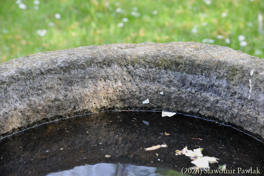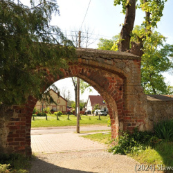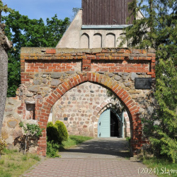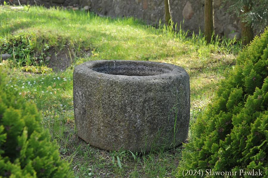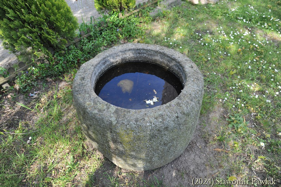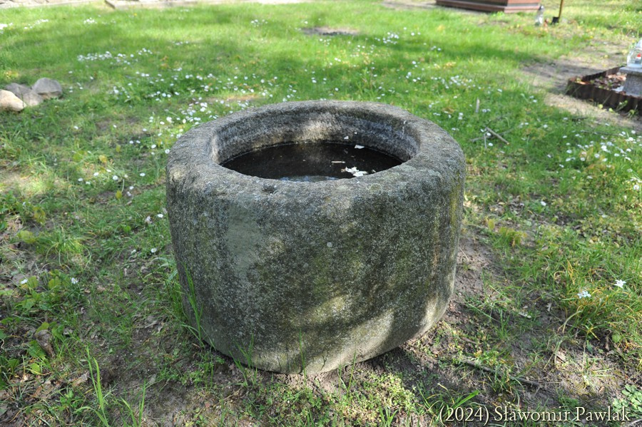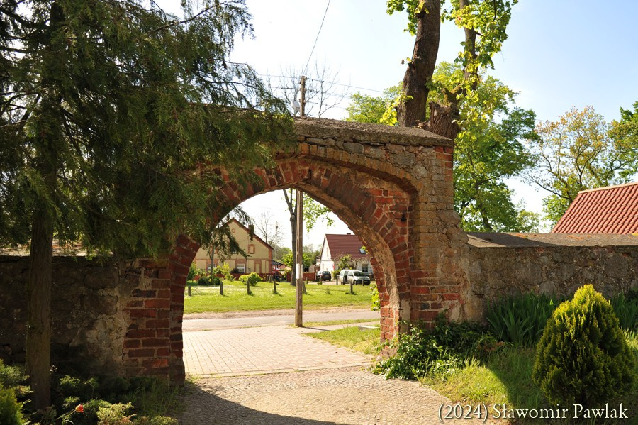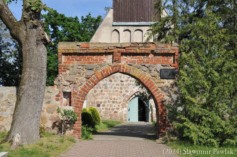 Plac kościelny o regularnym prostokątnym zarysie, otoczony kamiennym murem, do roku 1945 pełnił funkcję lokalnej nekropolii. Wszystkie nagrobki zostały usunięte w latach powojennych. Zachowała się późnogotycka kamienno-ceglana brama zachodnia wzniesiona w XV wieku z ostrołukowym przejazdem oraz zagłębionymi fryzami tynkowymi. Dwuskrzydłowe wrota nie zachowały się. Przed bramą usytuowana została niewielka kaplica przedpogrzebowa pochodząca zapewne z XIX wieku.