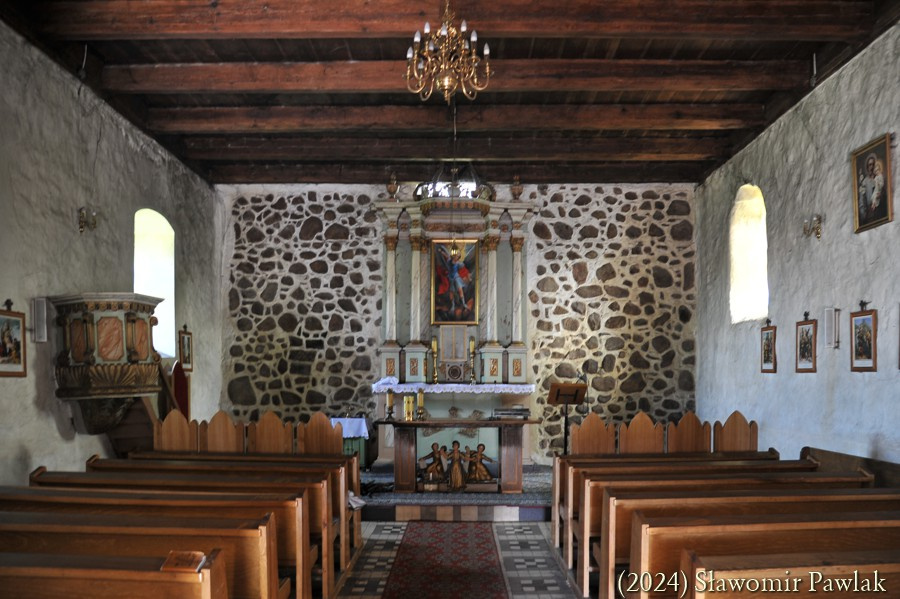 Wnętrze kościoła otynkowano i zamknięto płaskim stropem belkowym oraz dachem dwuspadowym krytym dachówką ceramiczną. Posadzka z XIX wiecznych płytek terakotowych.