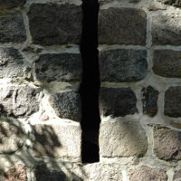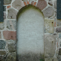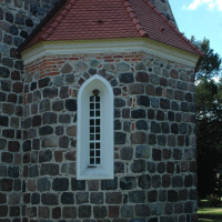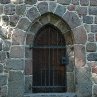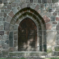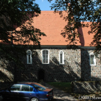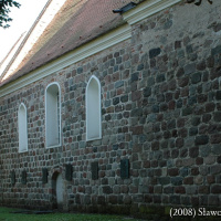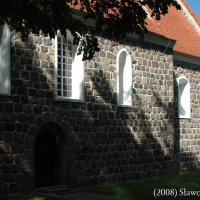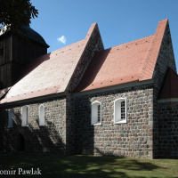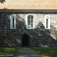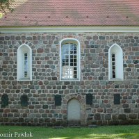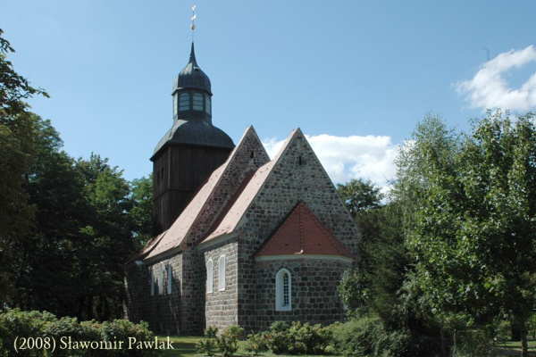 Portal główny usytuowano w podstawie zachodniej ściany wieży, na osi kościoła. Trójuskokowe szerokie ościeże wykonane z kwadr i klińców granitowych zamknięto zdecydowanym ostrołukiem bez elementu zwornikowego. Ostrołukowy wykrój otrzymały także pozostałe portale: w południowej ścianie nawy o dwuuskokowym ościeżu, w ścianie północnej nawy o jednouskokowym ościeżu (obecnie zamurowany) oraz w zachodniej partii ściany południowej prezbiterium o jednouskokowym ościeżu (obecnie zamurowany).