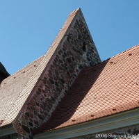 Do ściany północnej prezbiterium dobudowana była niewielka zakrystia o planie prostokąta, zamknięta dachem pulpitowym. Obecnie zachowały się jedynie strzępia murów oraz zamurowany portal prowadzący do prezbiterium.